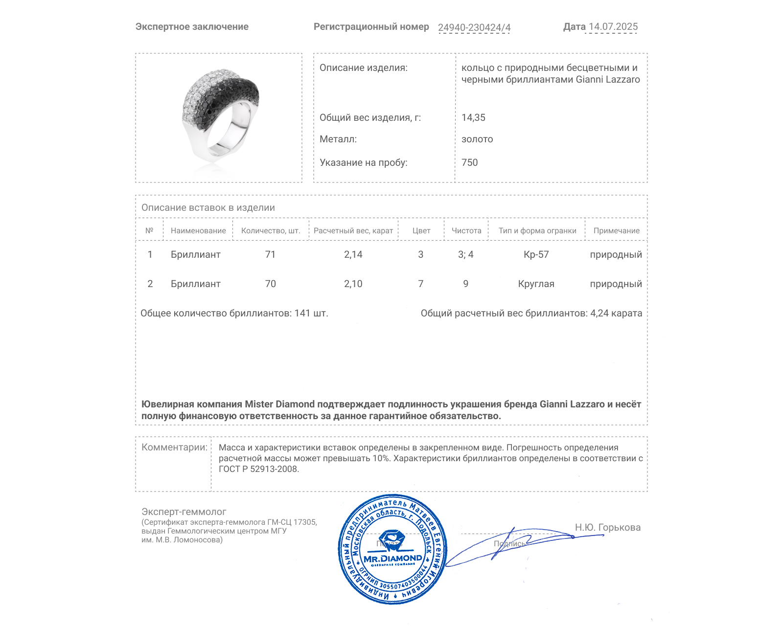 Оригинальное золотое кольцо с бриллиантами 4.24ct Gianni Lazzaro — настоящее произведение искусства, в котором воплощено не только мастерство ювелира, но и актуальные тренды. Это доказательство вашего изысканного вкуса, высокого статуса и яркий акцент в стильном образе. Вставка — 71 бриллиант круглой огранки 2.14ct 3/3-3/4, 70 черных бриллиантов круглой огранки 2.10ct 7/9, а обрамлением служит золото 750 пробы. Такое сочетание отлично смотрится и позволяет реализовывать самые необычные задумки вашего стиля. Размер ювелирного изделия — 17, бесплатно изменим на любой от 15 до 16.75, а общий вес — 14.35 г, и на пальце оно выглядит просто шикарно, сразу привлекая восхищенное внимание.
