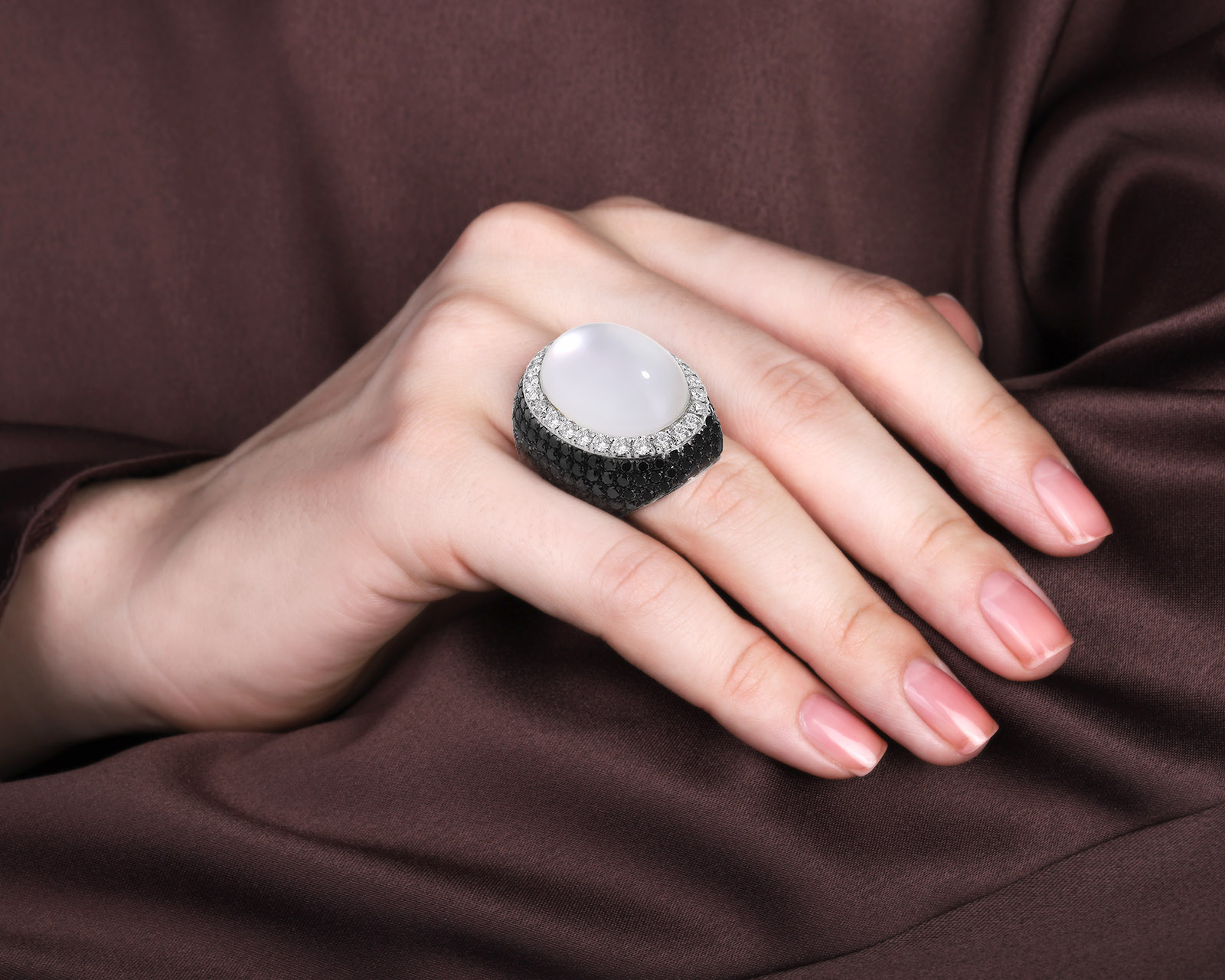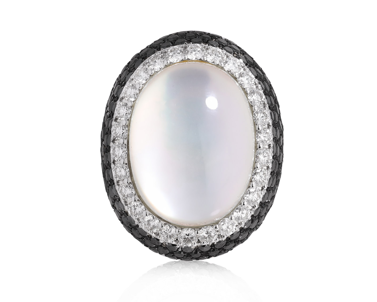 Оригинальное золотое кольцо с бриллиантами 5.56ct Leo Pizzo — настоящее произведение искусства, в котором воплощено не только мастерство ювелира, но и актуальные тренды. Это доказательство вашего изысканного вкуса, высокого статуса и яркий акцент в стильном образе. Вставка — 89 бриллиантов круглой огранки 2.72ct 3/3-3/4, 66 черных бриллиантов круглой огранки 2.84ct 7/9, а обрамлением служит золото 750 пробы. Такое сочетание отлично смотрится и позволяет реализовывать самые необычные задумки вашего стиля. Размер ювелирного изделия — 17.25, бесплатно изменим на любой от 15.25 до 17, а общий вес — 18.41 г, и на пальце оно выглядит просто шикарно, сразу привлекая восхищенное внимание.