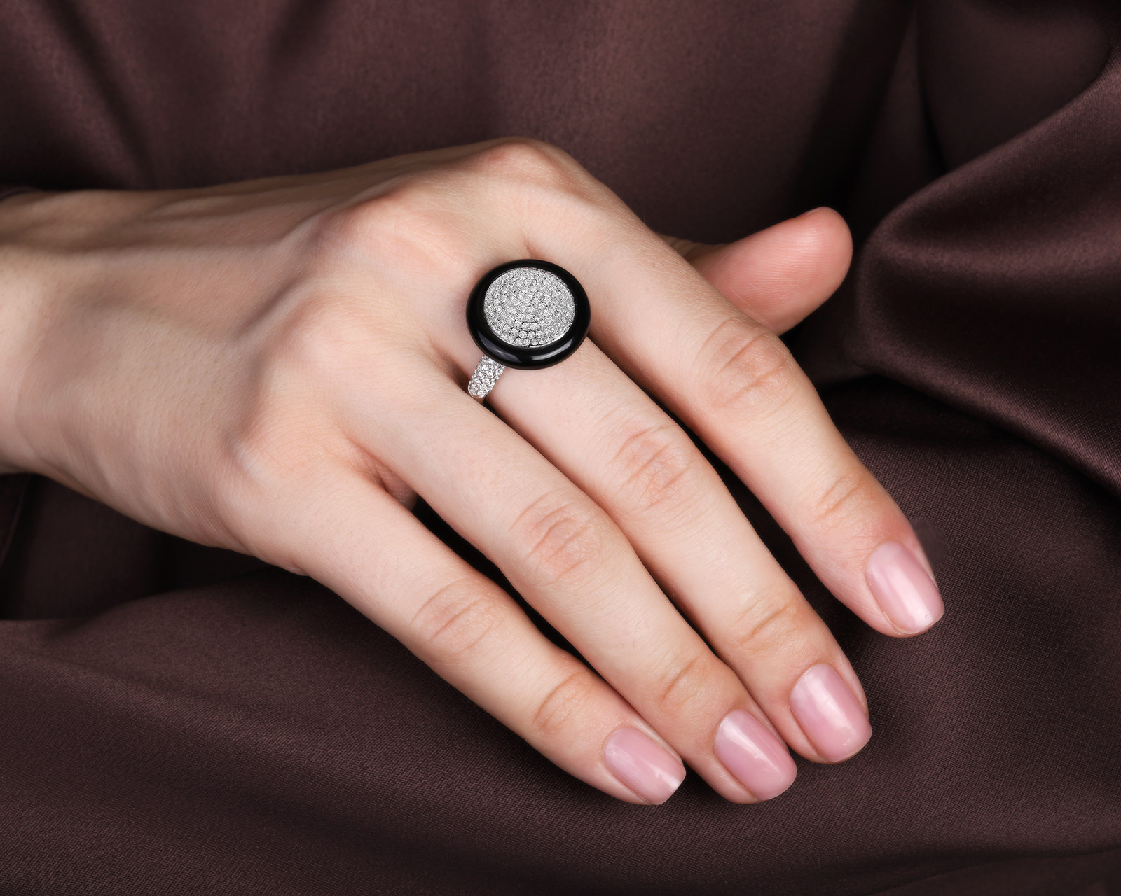 Оригинальное золотое кольцо с черным ониксом 1.18ct Roberto Bravo — настоящее произведение искусства, в котором воплощено не только мастерство ювелира, но и актуальные тренды. Это доказательство вашего изысканного вкуса, высокого статуса и яркий акцент в стильном образе. Вставка — 1 черный оникс фантазийной огранки 1.18ct, 207 бриллиантов круглой огранки 1.44ct 3/4-4/4, а обрамлением служит золото 750 пробы. Такое сочетание отлично смотрится и позволяет реализовывать самые необычные задумки вашего стиля. Размер ювелирного изделия — 18, а общий вес — 7.32 г, и на пальце оно выглядит просто шикарно, сразу привлекая восхищенное внимание.