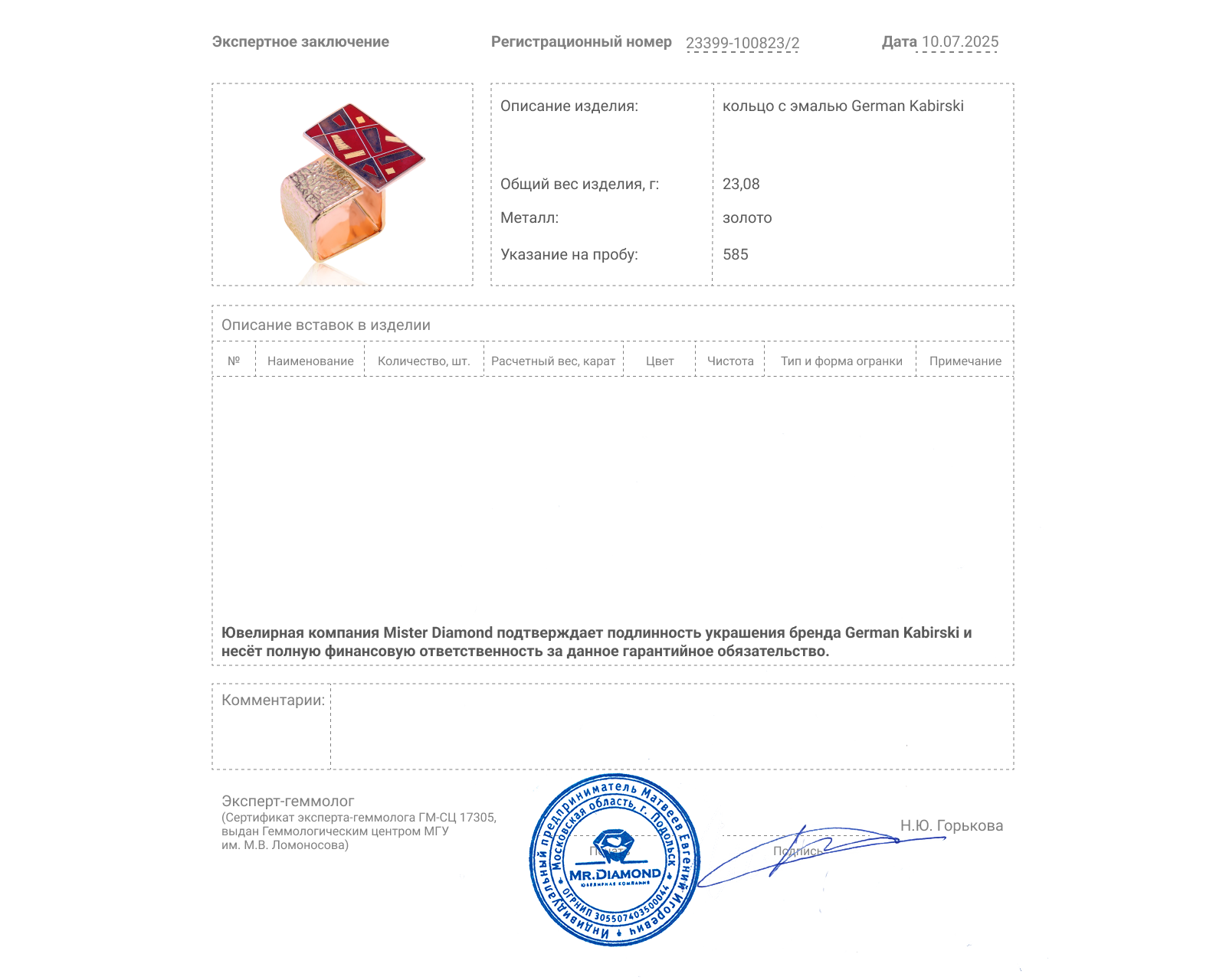 Оригинальное золотое кольцо с эмалью German Kabirski — настоящее произведение искусства, в котором воплощено не только мастерство ювелира, но и актуальные тренды. Это доказательство вашего изысканного вкуса, высокого статуса и яркий акцент в стильном образе. Такое сочетание отлично смотрится и позволяет реализовывать самые необычные задумки вашего стиля. Размер ювелирного изделия — 17.5, бесплатно изменим на любой от 16.5 до 18.5, а общий вес — 23.08 г, и на пальце оно выглядит просто шикарно, сразу привлекая восхищенное внимание.