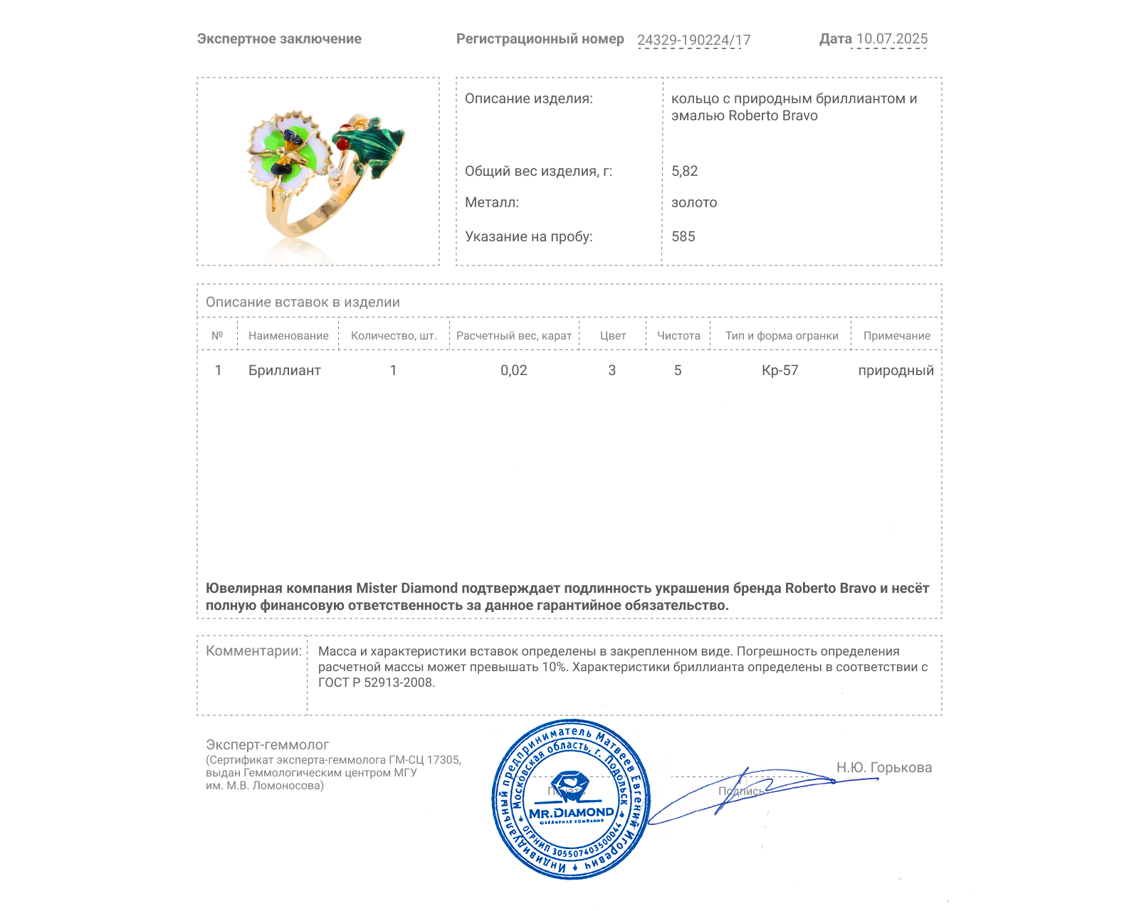 Оригинальное золотое кольцо с эмалью Roberto Bravo — настоящее произведение искусства, в котором воплощено не только мастерство ювелира, но и актуальные тренды. Это доказательство вашего изысканного вкуса, высокого статуса и яркий акцент в стильном образе. Вставка — 1 бриллиант круглой огранки 0.02ct 3/5, а обрамлением служит золото 585 пробы. Такое сочетание отлично смотрится и позволяет реализовывать самые необычные задумки вашего стиля. Размер ювелирного изделия — 18, бесплатно изменим на любой от 17 до 19.5, а общий вес — 5.82 г, и на пальце оно выглядит просто шикарно, сразу привлекая восхищенное внимание.