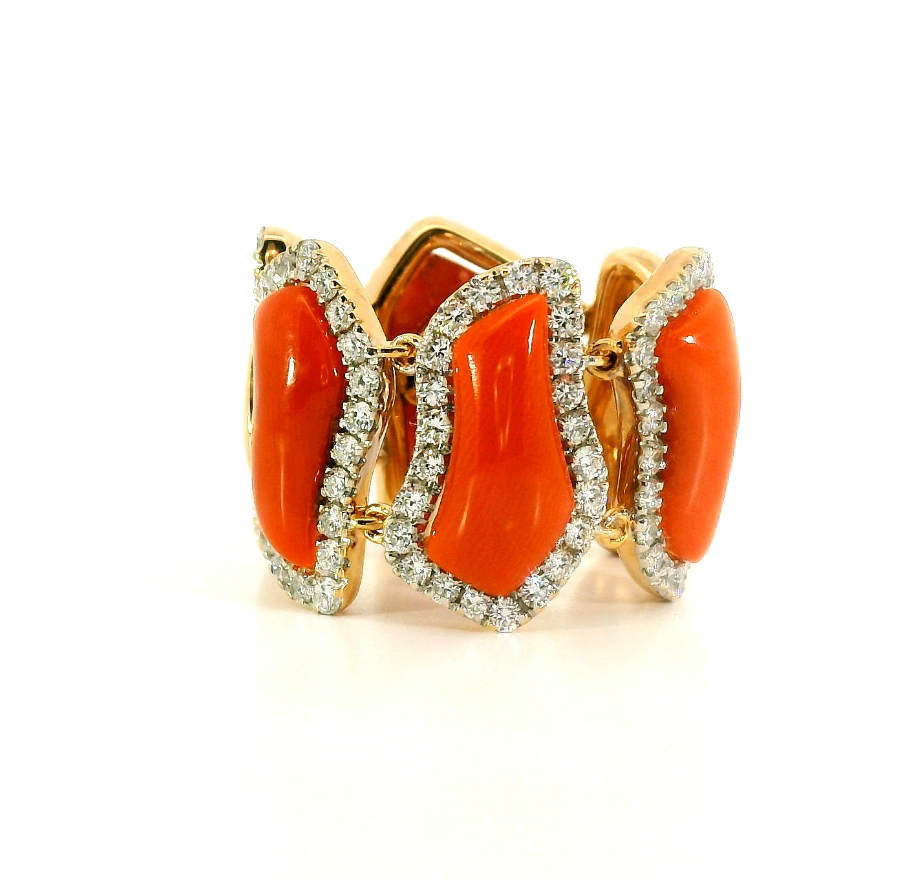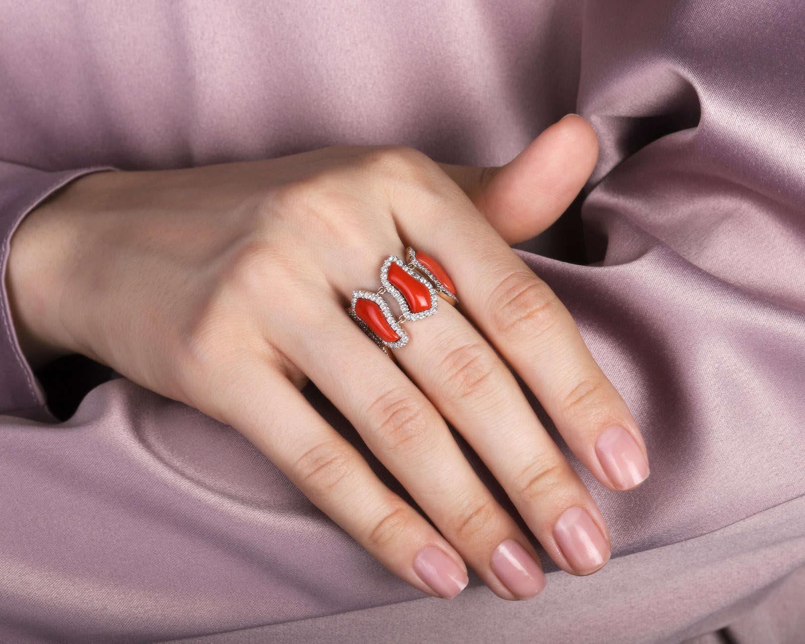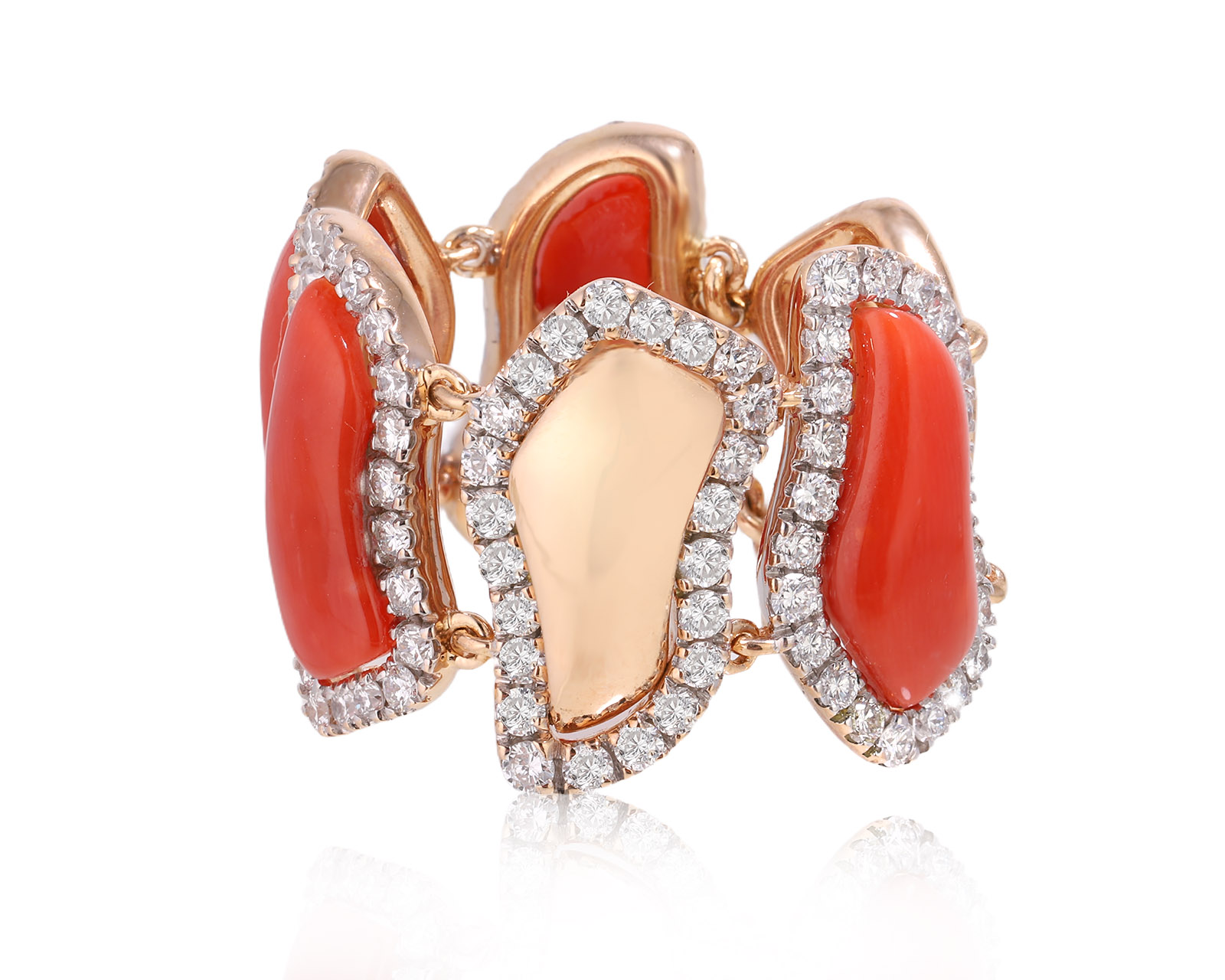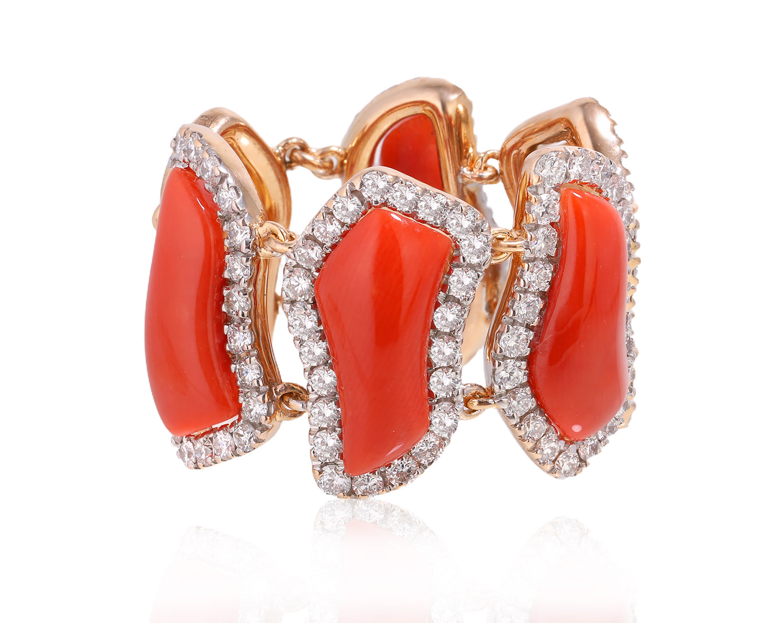 Оригинальное золотое кольцо с кораллами 4.80ct Chantecler Enchanté — настоящее произведение искусства, в котором воплощено не только мастерство ювелира, но и актуальные тренды. Это доказательство вашего изысканного вкуса, высокого статуса и яркий акцент в стильном образе. Вставка — 4 коралла огранки "фантазийный кабошон" 4.80ct, 115 бриллиантов круглой огранки 1.72ct 3/3-4/4, а обрамлением служит золото 750 пробы. Такое сочетание отлично смотрится и позволяет реализовывать самые необычные задумки вашего стиля. Размер ювелирного изделия — 18, а общий вес — 12.85 г, и на пальце оно выглядит просто шикарно, сразу привлекая восхищенное внимание.