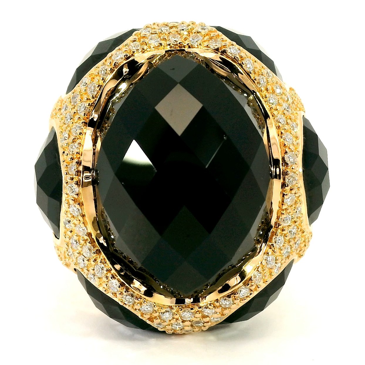 Оригинальное золотое кольцо с ониксом 36.33ct Belle Bague (GIM) — настоящее произведение искусства, в котором воплощено не только мастерство ювелира, но и актуальные тренды. Это доказательство вашего изысканного вкуса, высокого статуса и яркий акцент в стильном образе. Вставка — 1 оникс огранки "фантазийный овал" 22.65ct, 6 ониксов фантазийной огранки 13.68ct, 68 бриллиантов круглой огранки 0.45ct 3/3, а обрамлением служит золото 750 пробы. Такое сочетание отлично смотрится и позволяет реализовывать самые необычные задумки вашего стиля. Размер ювелирного изделия — 19, бесплатно изменим на 18, а общий вес — 20.53 г, и на пальце оно выглядит просто шикарно, сразу привлекая восхищенное внимание.