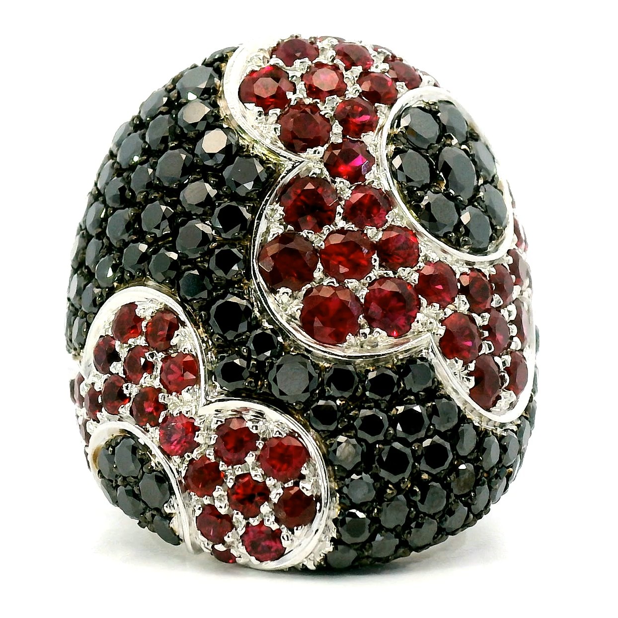Оригинальное золотое кольцо с рубинами 4.09ct Pasquale Bruni — настоящее произведение искусства, в котором воплощено не только мастерство ювелира, но и актуальные тренды. Это доказательство вашего изысканного вкуса, высокого статуса и яркий акцент в стильном образе. Вставка — 62 рубина круглой огранки 4.09ct 3/2-3/4, 106 черных бриллиантов круглой огранки 3.71ct 7/9, а обрамлением служит золото 750 пробы. Такое сочетание отлично смотрится и позволяет реализовывать самые необычные задумки вашего стиля. Размер ювелирного изделия — 16.25, а общий вес — 28.63 г, и на пальце оно выглядит просто шикарно, сразу привлекая восхищенное внимание.