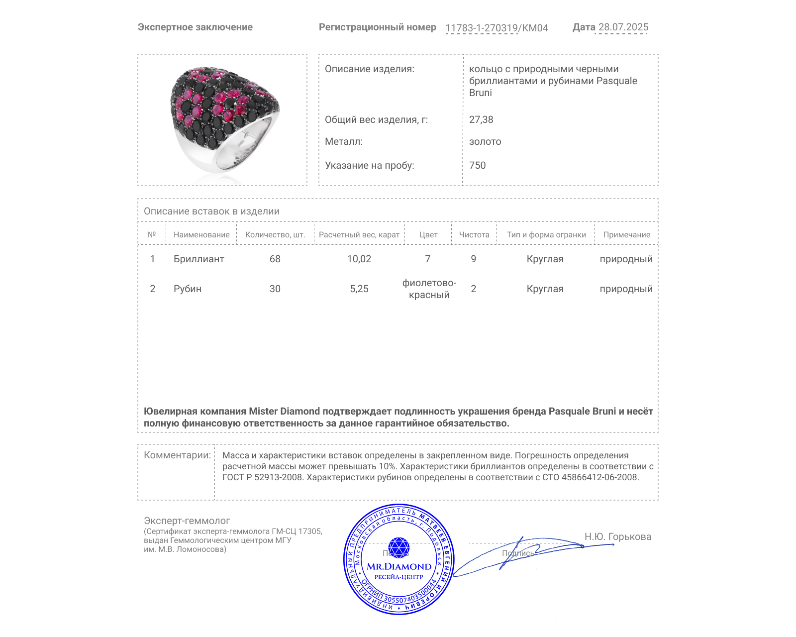 Оригинальное золотое кольцо с рубинами 5.25ct Pasquale Bruni — настоящее произведение искусства, в котором воплощено не только мастерство ювелира, но и актуальные тренды. Это доказательство вашего изысканного вкуса, высокого статуса и яркий акцент в стильном образе. Вставка — 30 рубинов круглой огранки 5.25ct фиолетово-красный/2-3, 68 черных бриллиантов круглой огранки 10.02ct, а обрамлением служит золото 750 пробы. Такое сочетание отлично смотрится и позволяет реализовывать самые необычные задумки вашего стиля. Размер ювелирного изделия — 17, бесплатно изменим на 15, а общий вес — 27.38 г, и на пальце оно выглядит просто шикарно, сразу привлекая восхищенное внимание.