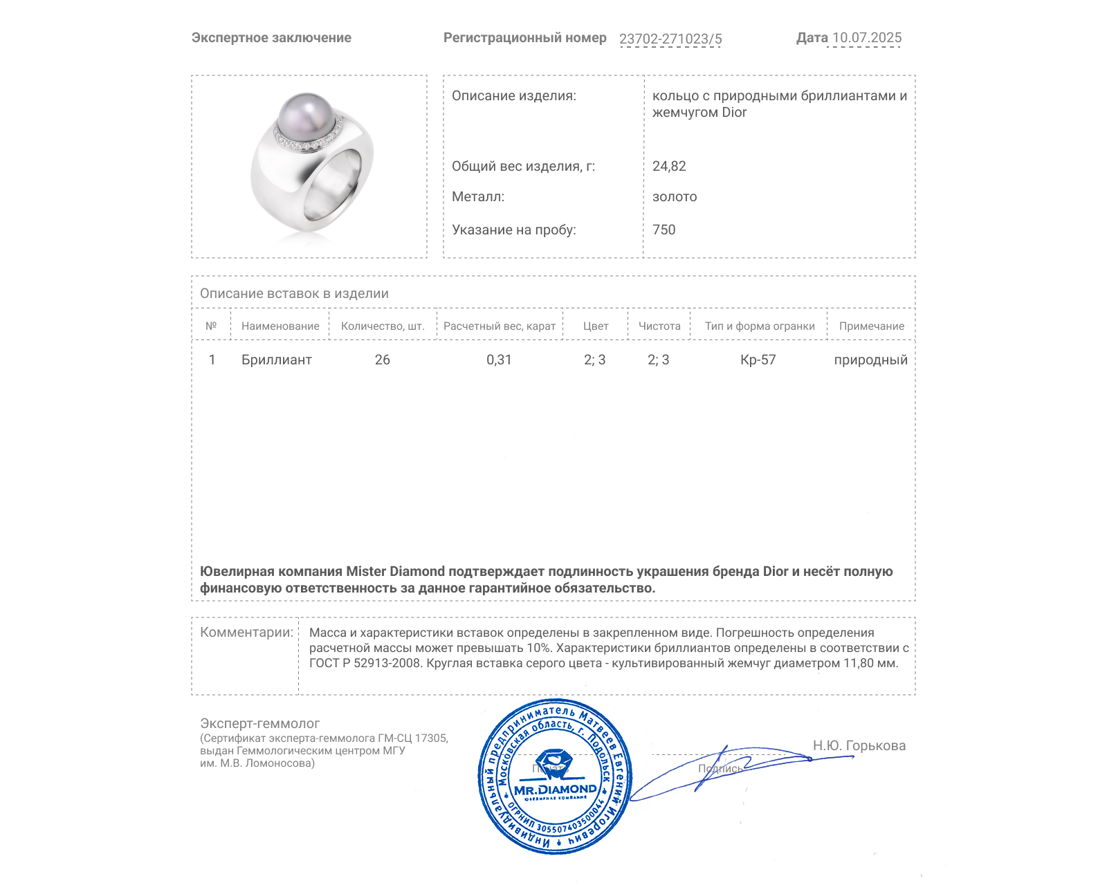 Оригинальное золотое кольцо с серым жемчугом Dior — настоящее произведение искусства, в котором воплощено не только мастерство ювелира, но и актуальные тренды. Это доказательство вашего изысканного вкуса, высокого статуса и яркий акцент в стильном образе. Вставка — 1 жемчуг 11.80 мм, 26 бриллиантов круглой огранки 0.31ct 2/2-3/3, а обрамлением служит золото 750 пробы. Такое сочетание отлично смотрится и позволяет реализовывать самые необычные задумки вашего стиля. Размер ювелирного изделия — 17, бесплатно изменим на любой от 15 до 16.75, а общий вес — 24.82 г, и на пальце оно выглядит просто шикарно, сразу привлекая восхищенное внимание.