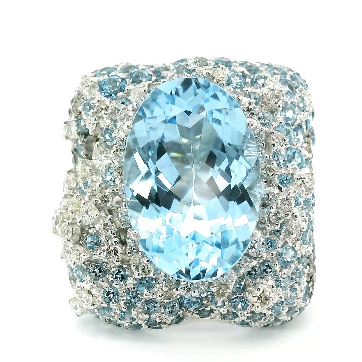 Оригинальное золотое кольцо с топазами 20.70ct Brumani — настоящее произведение искусства, в котором воплощено не только мастерство ювелира, но и актуальные тренды. Это доказательство вашего изысканного вкуса, высокого статуса и яркий акцент в стильном образе. Вставка — 1 топаз "Sky Blue" овальной огранки 13.50ct, 140 топазов круглой огранки 7.20ct, 58 бриллиантов круглой огранки 1.30ct 3/4-3/5, 35 бриллиантов круглой огранки 1.20ct 7/5-7/6, а обрамлением служит золото 750 пробы. Такое сочетание отлично смотрится и позволяет реализовывать самые необычные задумки вашего стиля. Размер ювелирного изделия — 18, бесплатно изменим на любой от 17 до 19, а общий вес — 17.75 г, и на пальце оно выглядит просто шикарно, сразу привлекая восхищенное внимание.