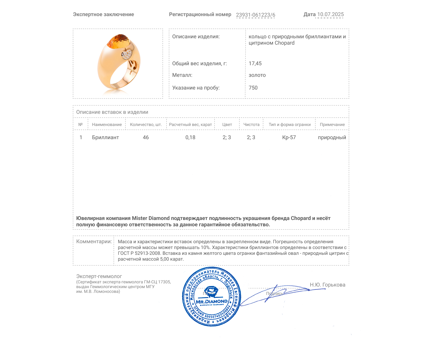 Оригинальное золотое кольцо с цитрином 5.00ct Chopard — настоящее произведение искусства, в котором воплощено не только мастерство ювелира, но и актуальные тренды. Это доказательство вашего изысканного вкуса, высокого статуса и яркий акцент в стильном образе. Вставка — 1 цитрин огранки "фантазийный овал" 5.00ct, 46 бриллиантов круглой огранки 0.18ct 2/2-3/3, а обрамлением служит золото 750 пробы. Такое сочетание отлично смотрится и позволяет реализовывать самые необычные задумки вашего стиля. Размер ювелирного изделия — 17.5, бесплатно изменим на любой от 17 до 18.5, а общий вес — 17.45 г, и на пальце оно выглядит просто шикарно, сразу привлекая восхищенное внимание.