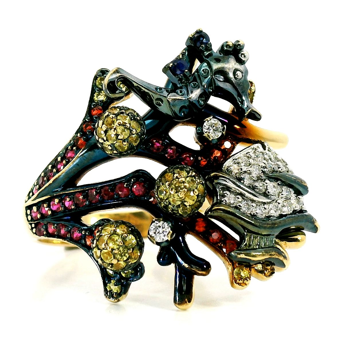 Оригинальное золотое кольцо с цветными камнями 1.45ct Roberto Bravo Le Grand Bleu — настоящее произведение искусства, в котором воплощено не только мастерство ювелира, но и актуальные тренды. Это доказательство вашего изысканного вкуса, высокого статуса и яркий акцент в стильном образе. Вставка — 15 оранжевых сапфиров круглой огранки 0.27ct, 46 желтых сапфиров круглой гранки 0.79ct, 2 сапфира круглой огранки 0.04ct 3/3, 21 рубин круглой огранки 0.35ct 5/3, 19 бриллиантов круглой огранки 0.21ct 3/5, а обрамлением служит золото 585 пробы. Такое сочетание отлично смотрится и позволяет реализовывать самые необычные задумки вашего стиля. Размер ювелирного изделия — 18, а общий вес — 8.66 г, и на пальце оно выглядит просто шикарно, сразу привлекая восхищенное внимание.