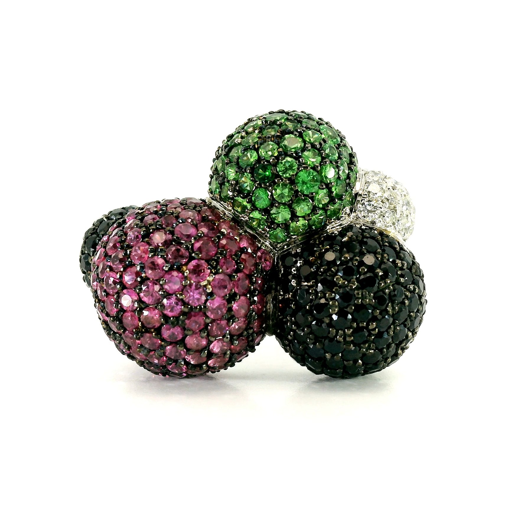 Оригинальное золотое кольцо с цветными камнями 8.41ct Salavetti — настоящее произведение искусства, в котором воплощено не только мастерство ювелира, но и актуальные тренды. Это доказательство вашего изысканного вкуса, высокого статуса и яркий акцент в стильном образе. Вставка — 117 темно-синих сапфиров круглой огранки 2.92ct, 110 розовых сапфиров круглой огранки 3.30ct, 73 тсаворита круглой огранки 2.19ct, 26 бриллиантов круглой огранки 0.35ct 3/3-3/5, а обрамлением служит золото 750 пробы. Такое сочетание отлично смотрится и позволяет реализовывать самые необычные задумки вашего стиля. Размер ювелирного изделия — 18, а общий вес — 16.66 г, и на пальце оно выглядит просто шикарно, сразу привлекая восхищенное внимание.