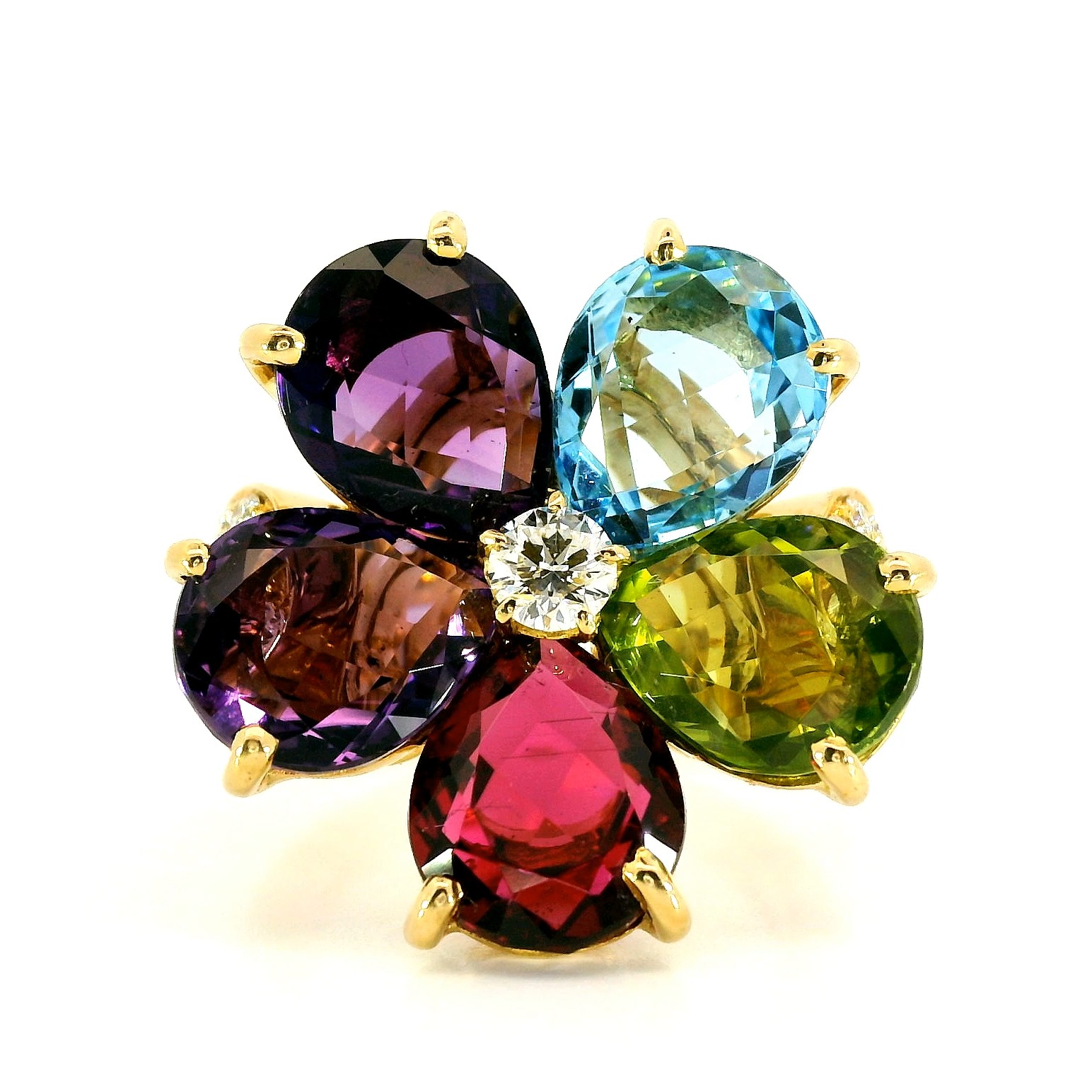Оригинальное золотое кольцо с цветными камнями 8.91ct Bvlgari Flower — настоящее произведение искусства, в котором воплощено не только мастерство ювелира, но и актуальные тренды. Это доказательство вашего изысканного вкуса, высокого статуса и яркий акцент в стильном образе. Вставка — 2 аметиста огранки "груша" 3.10ct, 1 топаз огранки "груша" 2.06ct, 1 хризолит огранки "груша" 1.95ct, 1 турмалин огранки "груша" 1.80ct, 1 бриллиант круглой огранки 0.20ct 3/3, 24 бриллианта круглой огранки 0.30ct 3/3, а обрамлением служит золото 750 пробы. Такое сочетание отлично смотрится и позволяет реализовывать самые необычные задумки вашего стиля. Размер ювелирного изделия — 16, а общий вес — 12.55 г, и на пальце оно выглядит просто шикарно, сразу привлекая восхищенное внимание.
