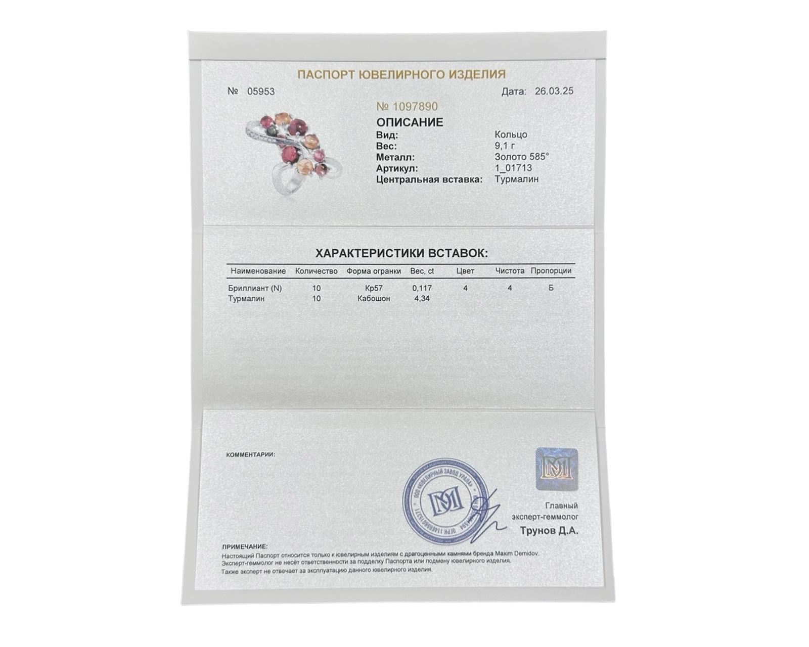 Оригинальное золотое кольцо с турмалинами 4.34ct Maxim Demidov — настоящее произведение искусства, в котором воплощено не только мастерство ювелира, но и актуальные тренды. Это доказательство вашего изысканного вкуса, высокого статуса и яркий акцент в стильном образе. Вставка — 10 турмалинов огранки "круглый кабошон" 4.34ct, 10 бриллиантов круглой огранки 0.11ct 4/4, Артикул производителя: 10978900, а обрамлением служит золото 585 пробы. Такое сочетание отлично смотрится и позволяет реализовывать самые необычные задумки вашего стиля. Размер ювелирного изделия — 17.5, бесплатно изменим на любой от 16.5 до 19, а общий вес — 9.1 г, и на пальце оно выглядит просто шикарно, сразу привлекая восхищенное внимание.