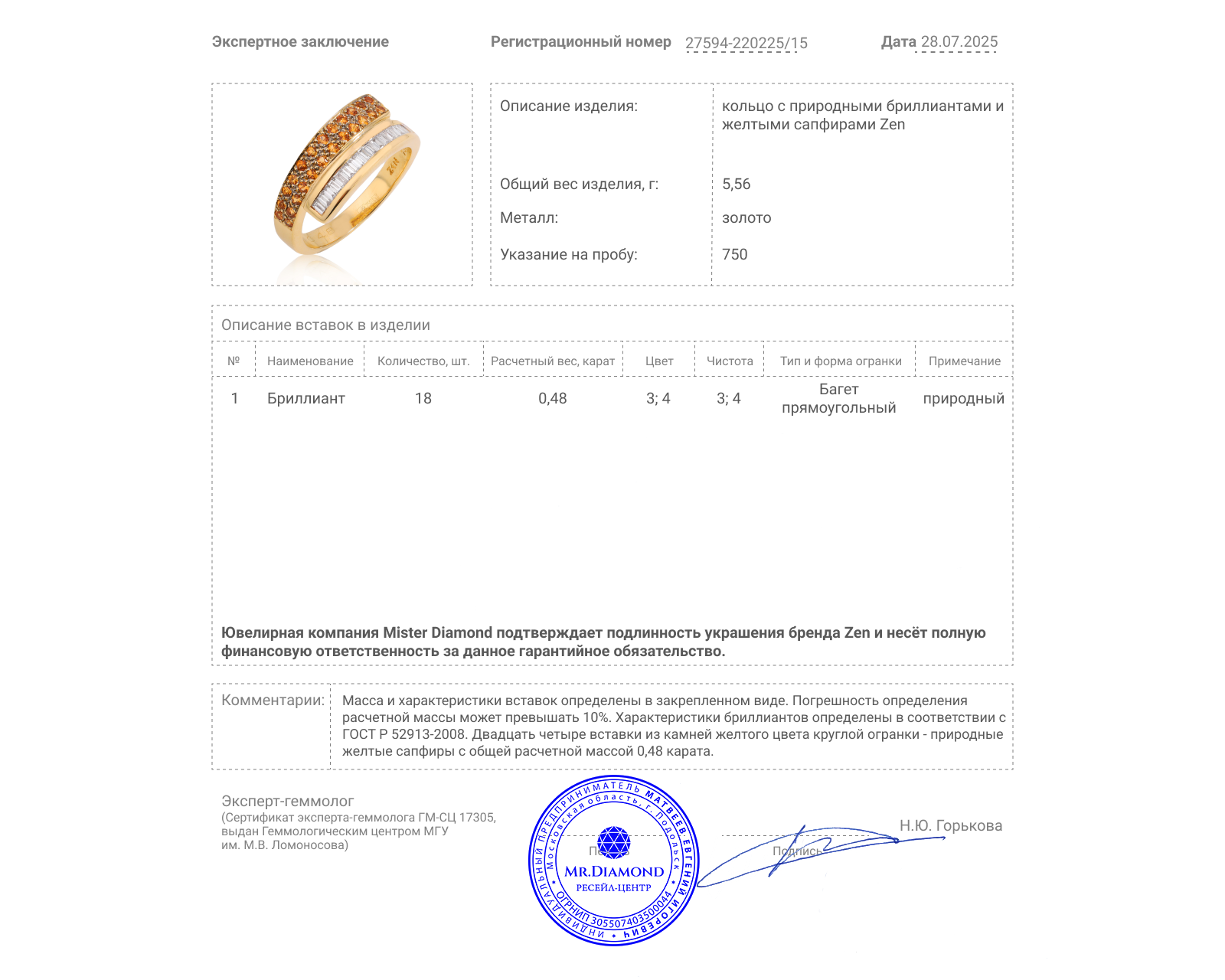 Оригинальное золотое кольцо с желтыми сапфирами 0.48ct Zen — настоящее произведение искусства, в котором воплощено не только мастерство ювелира, но и актуальные тренды. Это доказательство вашего изысканного вкуса, высокого статуса и яркий акцент в стильном образе. Вставка — 24 желтых сапфира круглой огранки 0.48ct, 18 бриллиантов огранки "прямоугольный багет" 0.48ct 3/3-4/4, а обрамлением служит золото 750 пробы. Такое сочетание отлично смотрится и позволяет реализовывать самые необычные задумки вашего стиля. Размер ювелирного изделия — 18, бесплатно изменим на любой от 17 до 19, а общий вес — 5.56 г, и на пальце оно выглядит просто шикарно, сразу привлекая восхищенное внимание.