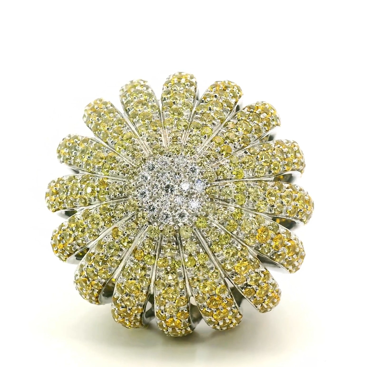 Оригинальное золотое кольцо с желтыми сапфирами 10.72ct Palmiero — настоящее произведение искусства, в котором воплощено не только мастерство ювелира, но и актуальные тренды. Это доказательство вашего изысканного вкуса, высокого статуса и яркий акцент в стильном образе. Вставка — 558 желтых сапфиров круглой огранки 10.72ct, 18 бриллиантов круглой огранки 0.20ct 3/3, а обрамлением служит золото 750 пробы. Такое сочетание отлично смотрится и позволяет реализовывать самые необычные задумки вашего стиля. Размер ювелирного изделия — 17.5, а общий вес — 33.76 г, и на пальце оно выглядит просто шикарно, сразу привлекая восхищенное внимание.