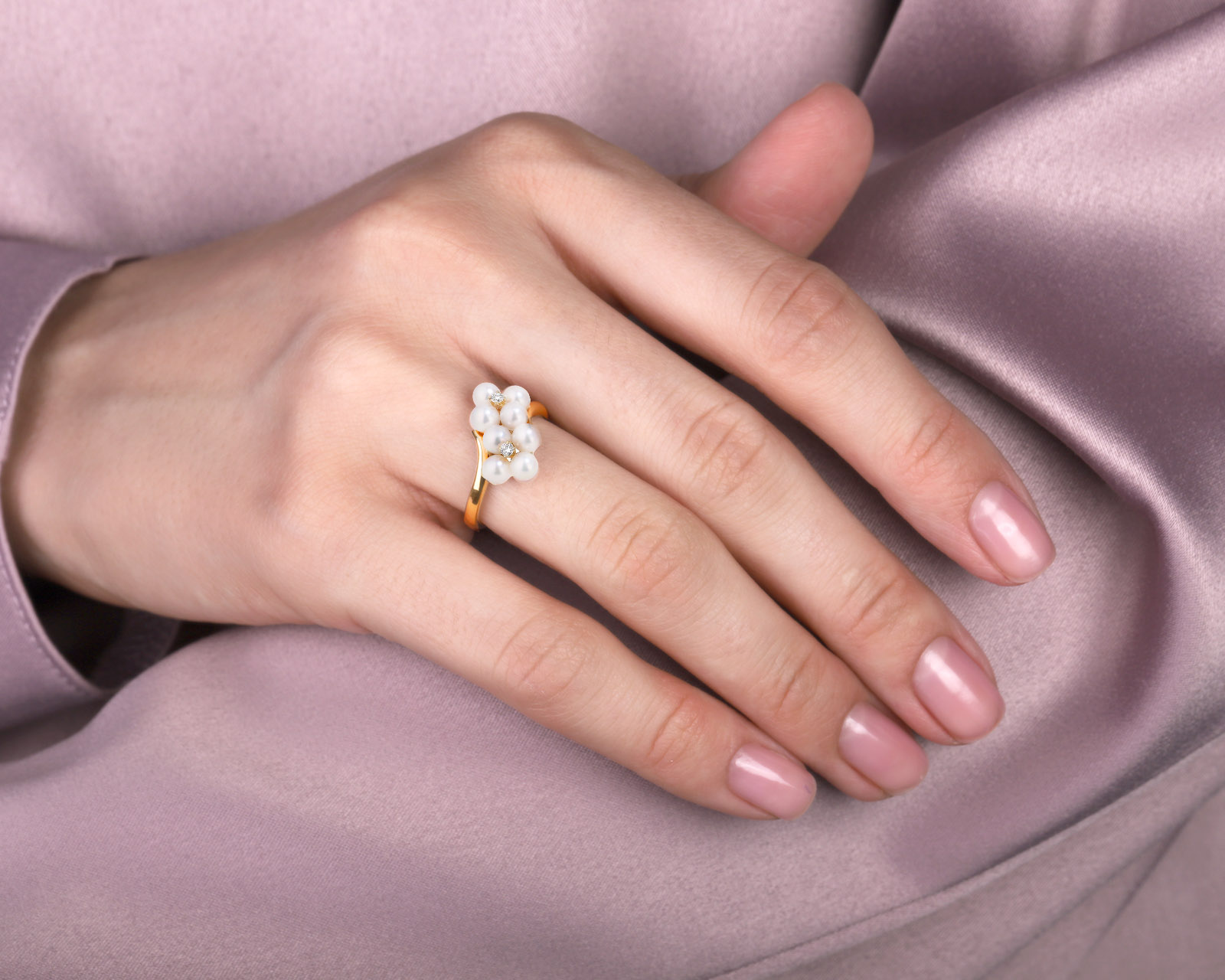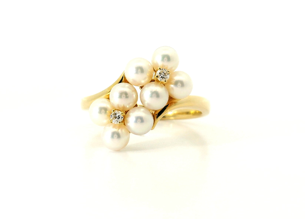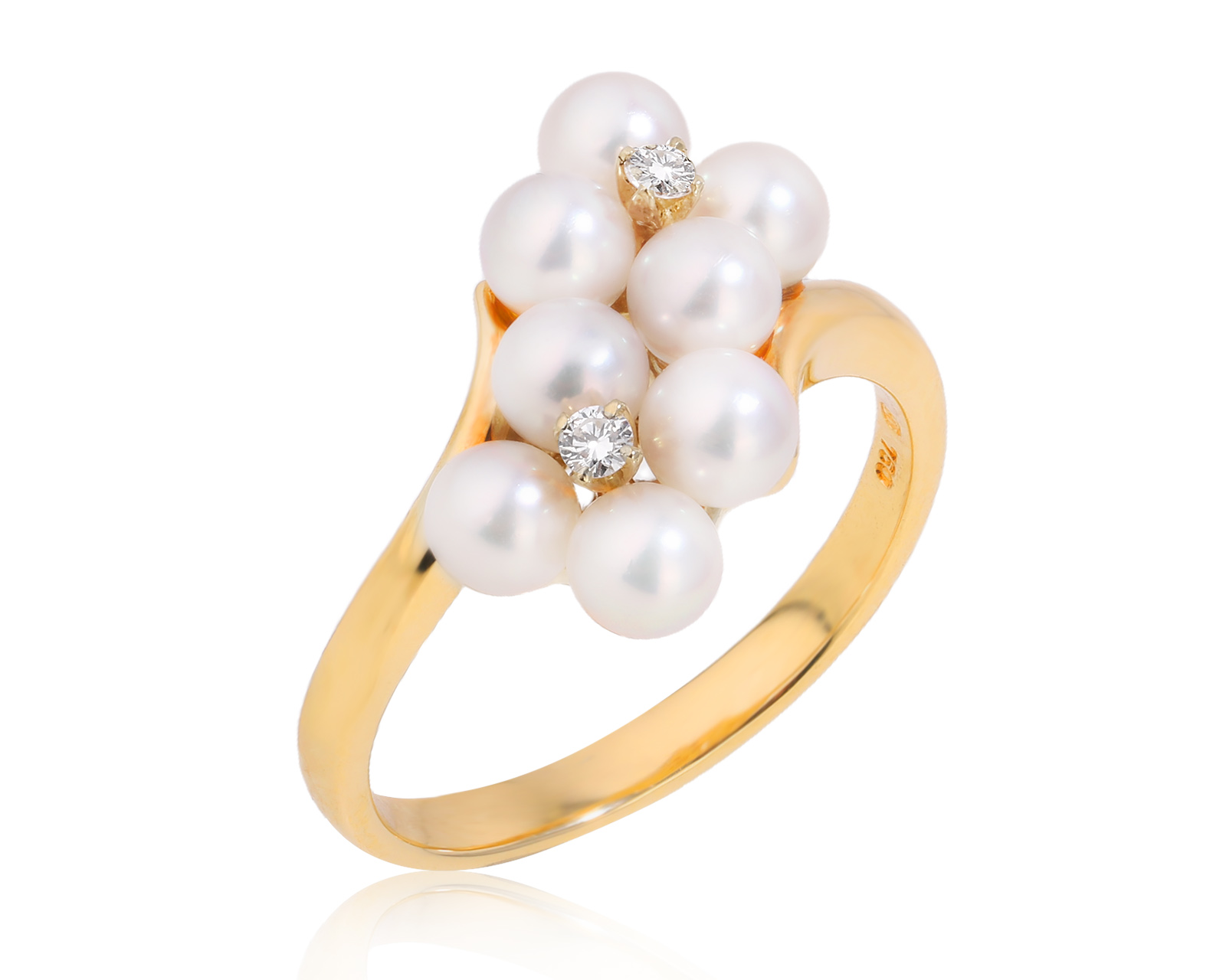 Оригинальное золотое кольцо с жемчугом 3.75 мм Mikimoto — настоящее произведение искусства, в котором воплощено не только мастерство ювелира, но и актуальные тренды. Это доказательство вашего изысканного вкуса, высокого статуса и яркий акцент в стильном образе. Вставка — 8 жемчужин 3.75 мм, 2 бриллианта круглой огранки 0.04ct 3/3, а обрамлением служит золото 750 пробы. Такое сочетание отлично смотрится и позволяет реализовывать самые необычные задумки вашего стиля. Размер ювелирного изделия — 16.25, бесплатно изменим на любой от 15.25 до 17.25, а общий вес — 3.96 г, и на пальце оно выглядит просто шикарно, сразу привлекая восхищенное внимание.