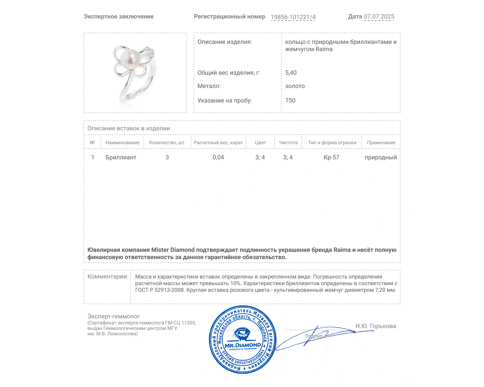 Оригинальное золотое кольцо с жемчугом 7.20 мм Raima — настоящее произведение искусства, в котором воплощено не только мастерство ювелира, но и актуальные тренды. Это доказательство вашего изысканного вкуса, высокого статуса и яркий акцент в стильном образе. Вставка — 1 жемчужина 7.20 мм, 3 бриллианта круглой огранки 0.04ct 3/3-4/4, а обрамлением служит золото 750 пробы. Такое сочетание отлично смотрится и позволяет реализовывать самые необычные задумки вашего стиля. Размер ювелирного изделия — 15.5, бесплатно изменим на любой от 14 до 17, а общий вес — 5.4 г, и на пальце оно выглядит просто шикарно, сразу привлекая восхищенное внимание.