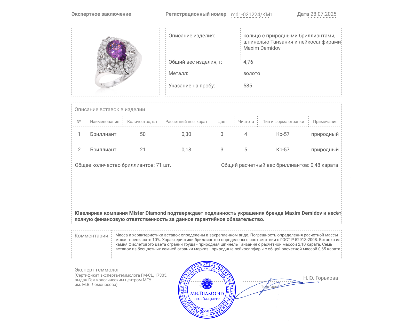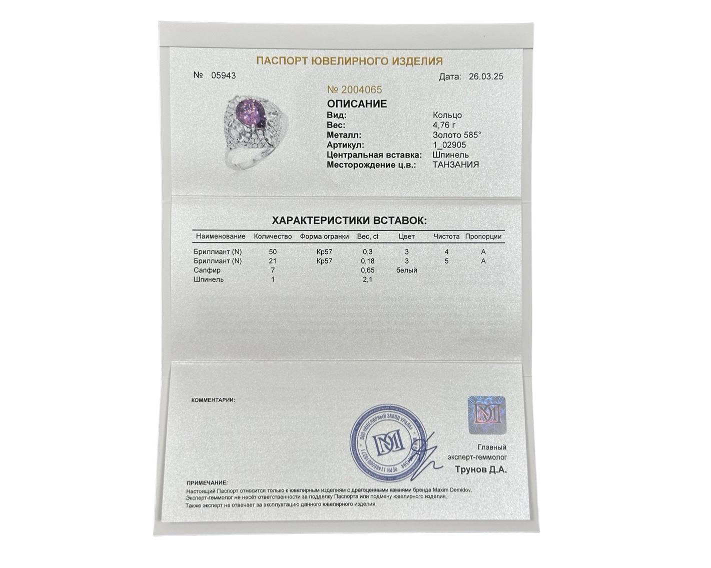 Оригинальное золотое кольцо со шпинелью Танзания 2.10ct Maxim Demidov — настоящее произведение искусства, в котором воплощено не только мастерство ювелира, но и актуальные тренды. Это доказательство вашего изысканного вкуса, высокого статуса и яркий акцент в стильном образе. Вставка — 1 шпинель Танзания огранки "груша" 2.10ct, 7 лейкосапфиров огранки "маркиз" 0.65ct, 50 бриллиантов круглой огранки 0.30ct 3/4, 21 бриллиант круглой огранки 0.18ct 3/5, Артикул производителя: 20040659, а обрамлением служит золото 585 пробы. Такое сочетание отлично смотрится и позволяет реализовывать самые необычные задумки вашего стиля. Размер ювелирного изделия — 17.5, бесплатно изменим на любой от 16.5 до 18.5, а общий вес — 4.76 г, и на пальце оно выглядит просто шикарно, сразу привлекая восхищенное внимание.