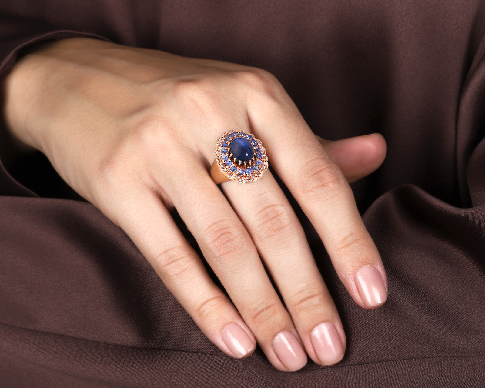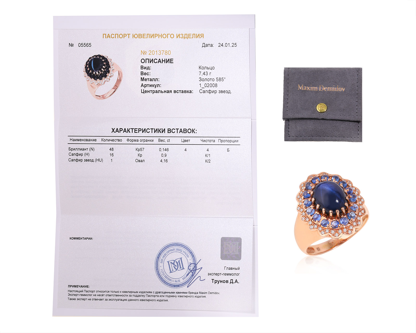 Оригинальное золотое кольцо со звездчатым сапфиром 4.16ct Maxim Demidov — настоящее произведение искусства, в котором воплощено не только мастерство ювелира, но и актуальные тренды. Это доказательство вашего изысканного вкуса, высокого статуса и яркий акцент в стильном образе. Вставка — 1 звездчатый сапфир огранки "овальный кабошон" 4.16ct Д/К2, 16 сапфиров огранки "круглый кабошон" 0.90ct 4/4, 48 бриллиантов круглой огранки 0.14ct 4/4, Артикул производителя: 20137809, а обрамлением служит золото 585 пробы. Такое сочетание отлично смотрится и позволяет реализовывать самые необычные задумки вашего стиля. Размер ювелирного изделия — 18, бесплатно изменим на любой от 17 до 19, а общий вес — 7.43 г, и на пальце оно выглядит просто шикарно, сразу привлекая восхищенное внимание.