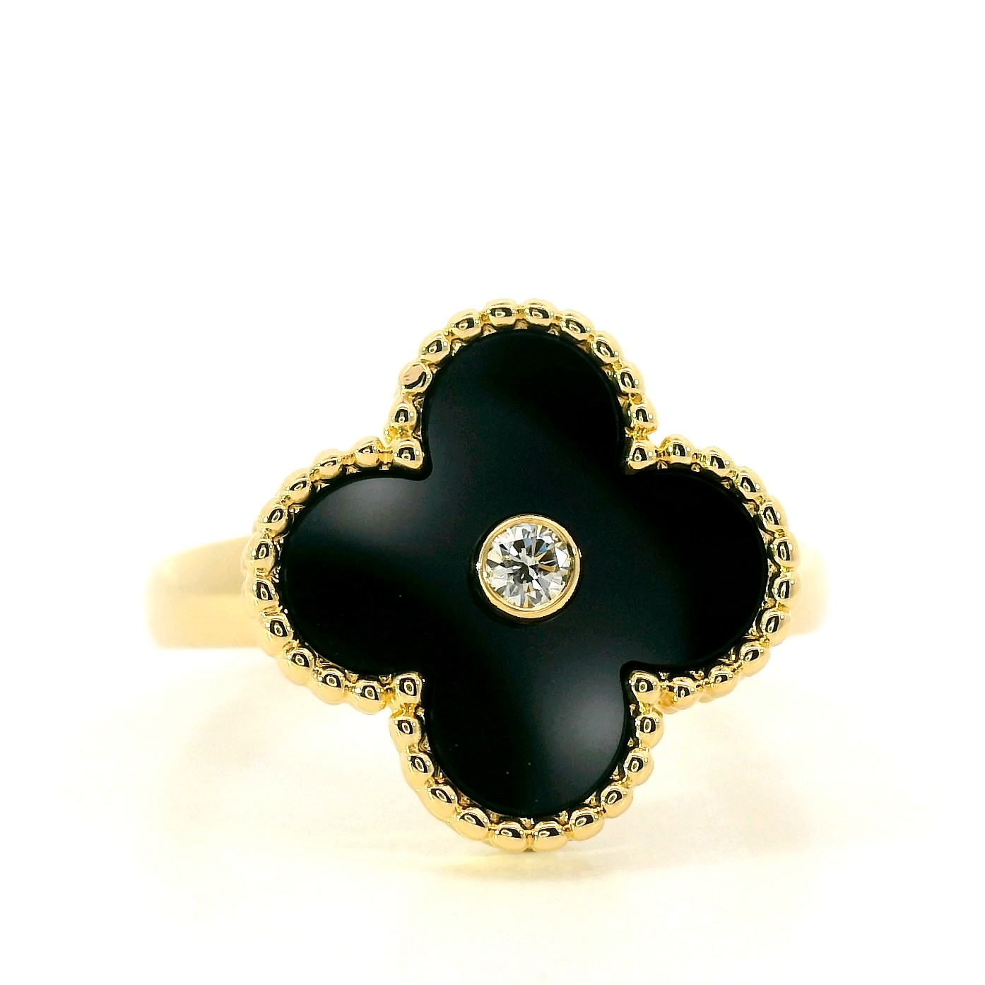 Оригинальное золотое кольцо Van Cleef & Arpels Alhambra — настоящее произведение искусства, в котором воплощено не только мастерство ювелира, но и актуальные тренды. Это доказательство вашего изысканного вкуса, высокого статуса и яркий акцент в стильном образе. Вставка — 1 бриллиант круглой огранки 0.05ct 3/3, 1 черный оникс фантазийной огранки, а обрамлением служит золото 750 пробы. Такое сочетание отлично смотрится и позволяет реализовывать самые необычные задумки вашего стиля. Размер ювелирного изделия — 17, а общий вес — 6.14 г, и на пальце оно выглядит просто шикарно, сразу привлекая восхищенное внимание.