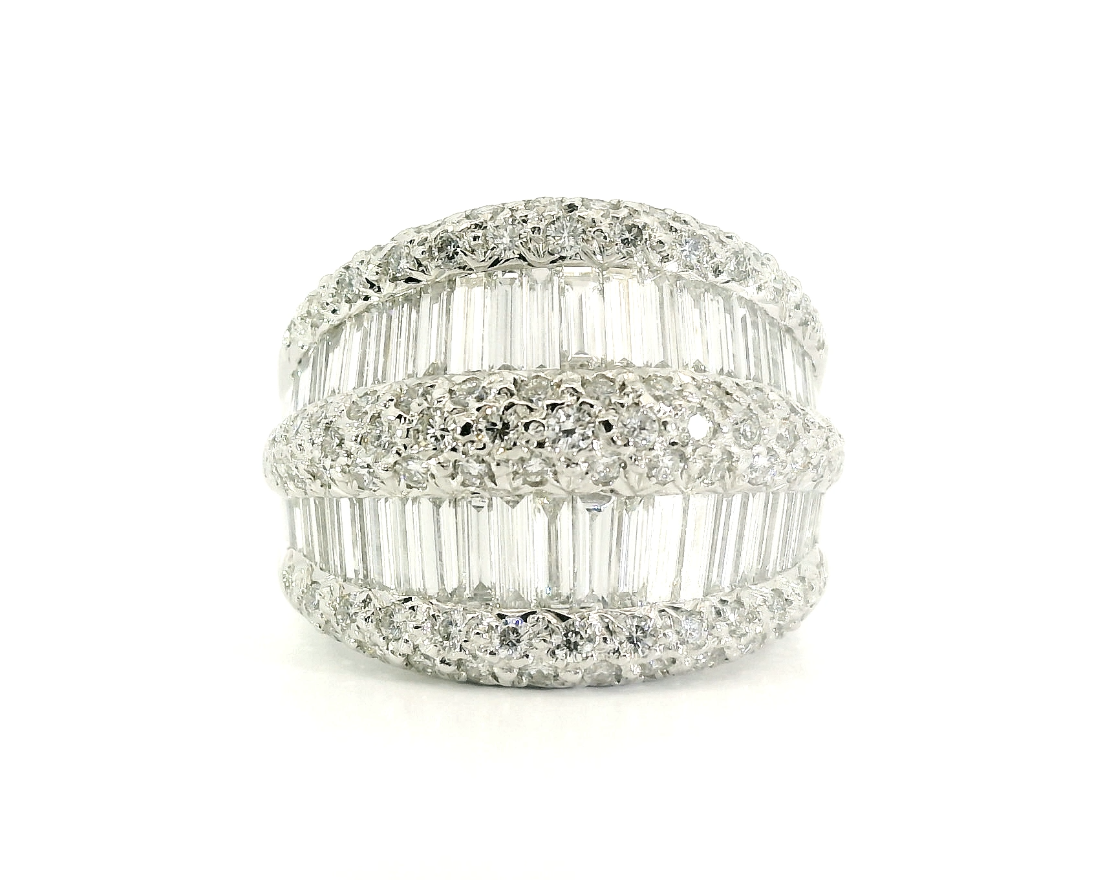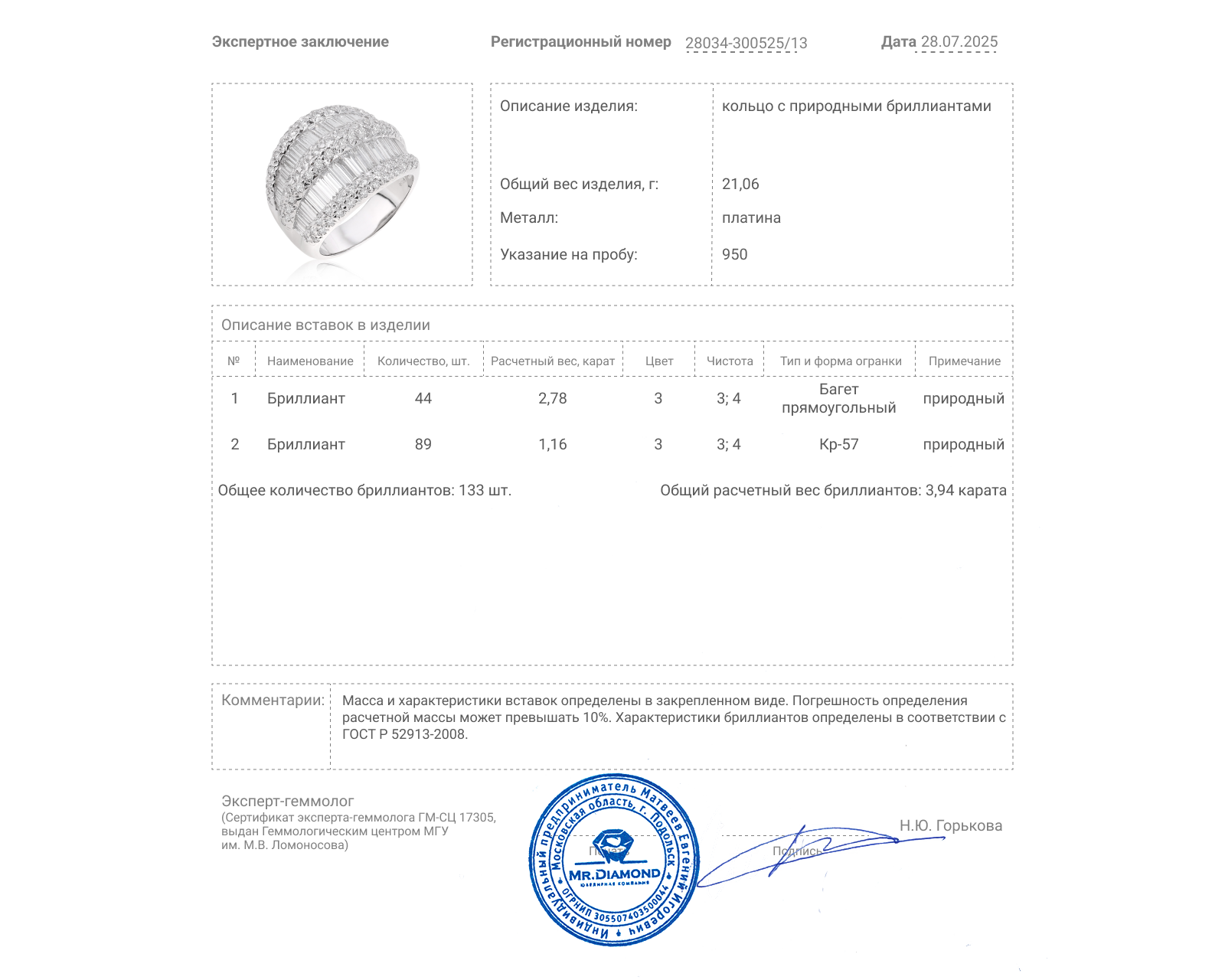 Платиновое кольцо с бриллиантами 3.94ct — настоящее произведение искусства, в котором воплощено не только мастерство ювелира, но и актуальные тренды. Это доказательство вашего изысканного вкуса, высокого статуса и яркий акцент в стильном образе. Вставка — 44 бриллианта огранки "прямоугольный багет" 2.78ct 3/3-3/4, 89 бриллиантов круглой огранки 1.16ct 3/3-3/4, а обрамлением служит платина 950 пробы. Такое сочетание отлично смотрится и позволяет реализовывать самые необычные задумки вашего стиля. Размер ювелирного изделия — 18.5, а общий вес — 21.06 г, и на пальце оно выглядит просто шикарно, сразу привлекая восхищенное внимание.