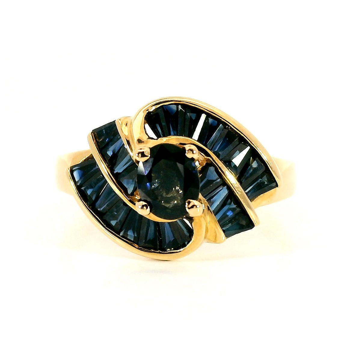 Праздничное золотое кольцо с сапфирами 1.90ct — настоящее произведение искусства, в котором воплощено не только мастерство ювелира, но и актуальные тренды. Это доказательство вашего изысканного вкуса, высокого статуса и яркий акцент в стильном образе. Вставка — 1 сапфир овальной огранки 0.45ct сине-зеленый/3, 24 сапфира огранки "багет" 1.45ct сине-зеленый/3, а обрамлением служит золото 585 пробы. Такое сочетание отлично смотрится и позволяет реализовывать самые необычные задумки вашего стиля. Размер ювелирного изделия — 18.25, бесплатно изменим на любой от 17.25 до 19.25, а общий вес — 4.51 г, и на пальце оно выглядит просто шикарно, сразу привлекая восхищенное внимание.