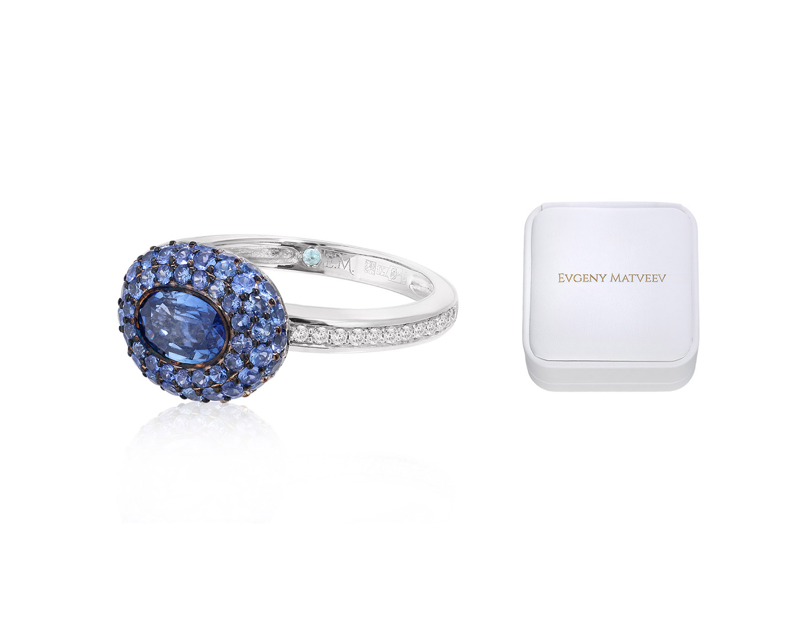 - дизайнерские модели фантазийной формы с большим сапфиром и россыпью бриллиантов;