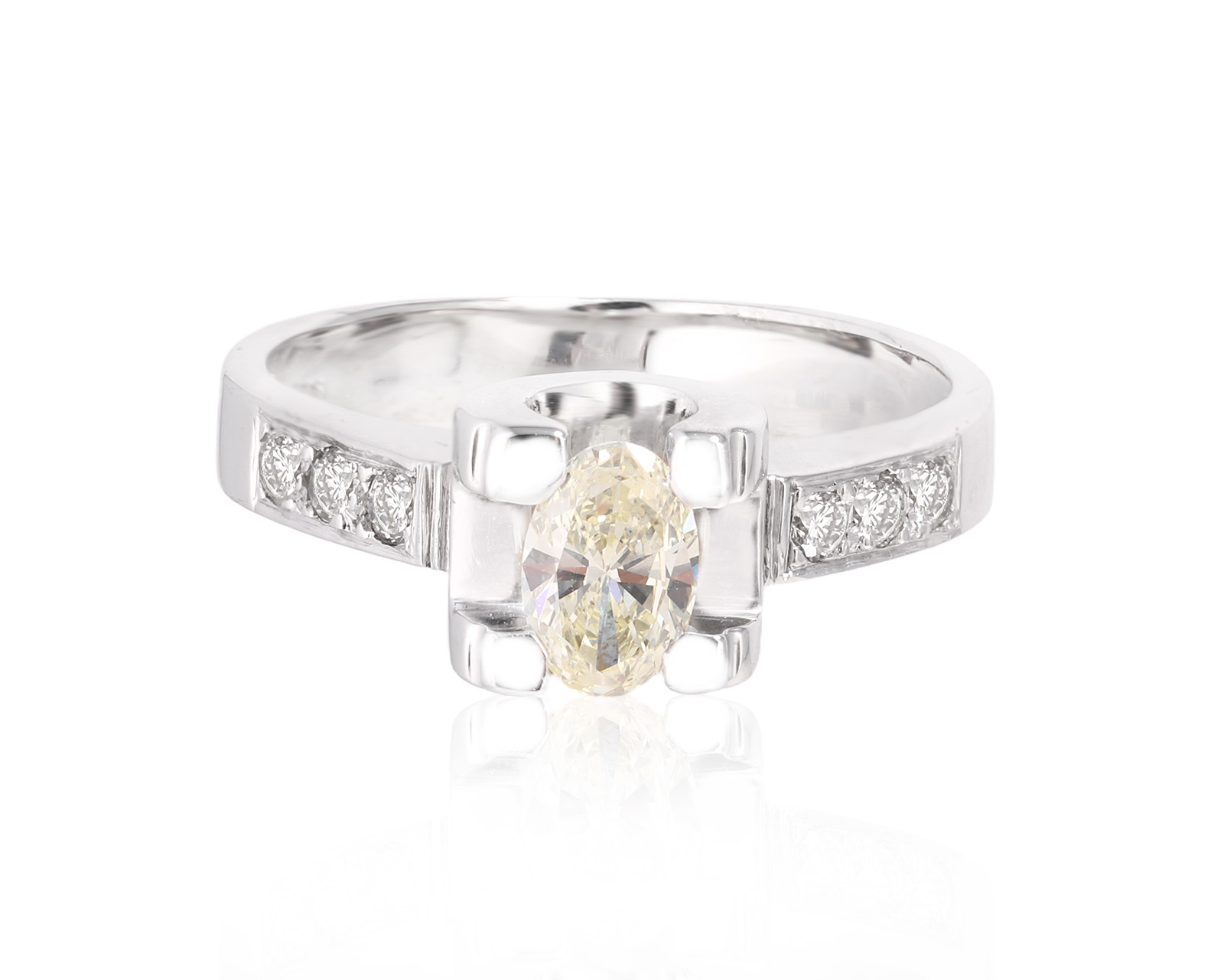 Золотое кольцо с бриллиантами 0.59ct — настоящее произведение искусства, в котором воплощено не только мастерство ювелира, но и актуальные тренды. Это доказательство вашего изысканного вкуса, высокого статуса и яркий акцент в стильном образе. Вставка — 1 бриллиант овальной огранки 0.44ct 8-3/5 (M/VS1), 6 бриллиантов круглой огранки 0.15ct 4/4-6/5, а обрамлением служит золото 585 пробы. Такое сочетание отлично смотрится и позволяет реализовывать самые необычные задумки вашего стиля. Размер ювелирного изделия — 17, бесплатно изменим на любой от 16.5 до 18, а общий вес — 5.01 г, и на пальце оно выглядит просто шикарно, сразу привлекая восхищенное внимание.