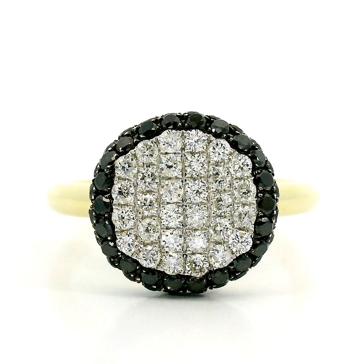 Золотое кольцо с бриллиантами 0.97ct — настоящее произведение искусства, в котором воплощено не только мастерство ювелира, но и актуальные тренды. Это доказательство вашего изысканного вкуса, высокого статуса и яркий акцент в стильном образе. Вставка — 30 бриллиантов круглой огранки 0.39ct 3/6, 46 черных бриллиантов круглой огранки 0.58ct 7/9, а обрамлением служит золото 585 пробы. Такое сочетание отлично смотрится и позволяет реализовывать самые необычные задумки вашего стиля. Размер ювелирного изделия — 17, бесплатно изменим на любой от 16 до 18, а общий вес — 2.7 г, и на пальце оно выглядит просто шикарно, сразу привлекая восхищенное внимание.
