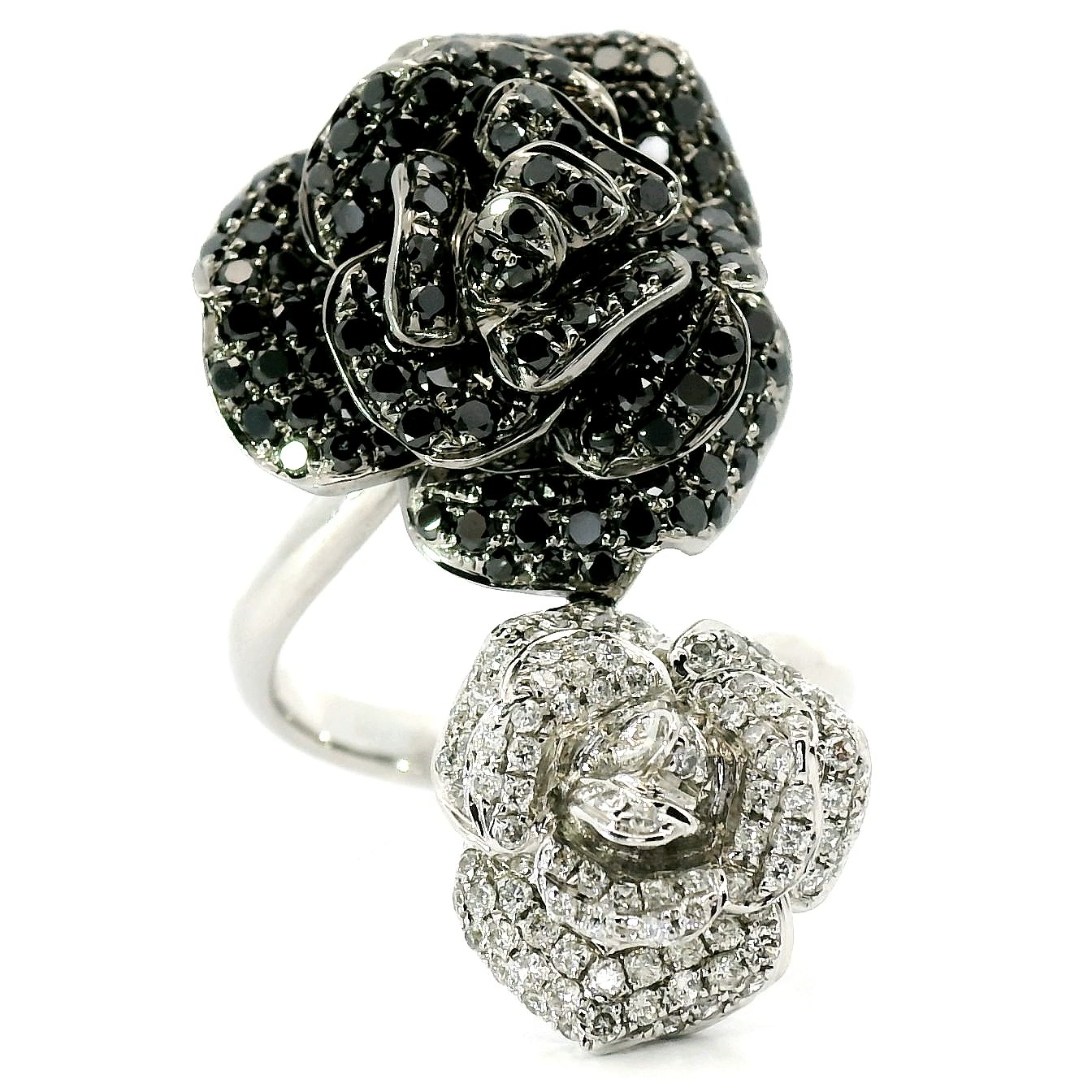 Золотое кольцо с бриллиантами 1.89ct — настоящее произведение искусства, в котором воплощено не только мастерство ювелира, но и актуальные тренды. Это доказательство вашего изысканного вкуса, высокого статуса и яркий акцент в стильном образе. Вставка — 110 бриллиантов круглой огранки 0.43ct 3/5-3/6, 125 черных бриллиантов круглой огранки 1.46ct 7/9, а обрамлением служит золото 585 пробы. Такое сочетание отлично смотрится и позволяет реализовывать самые необычные задумки вашего стиля. Размер ювелирного изделия — 17.5, а общий вес — 9 г, и на пальце оно выглядит просто шикарно, сразу привлекая восхищенное внимание.