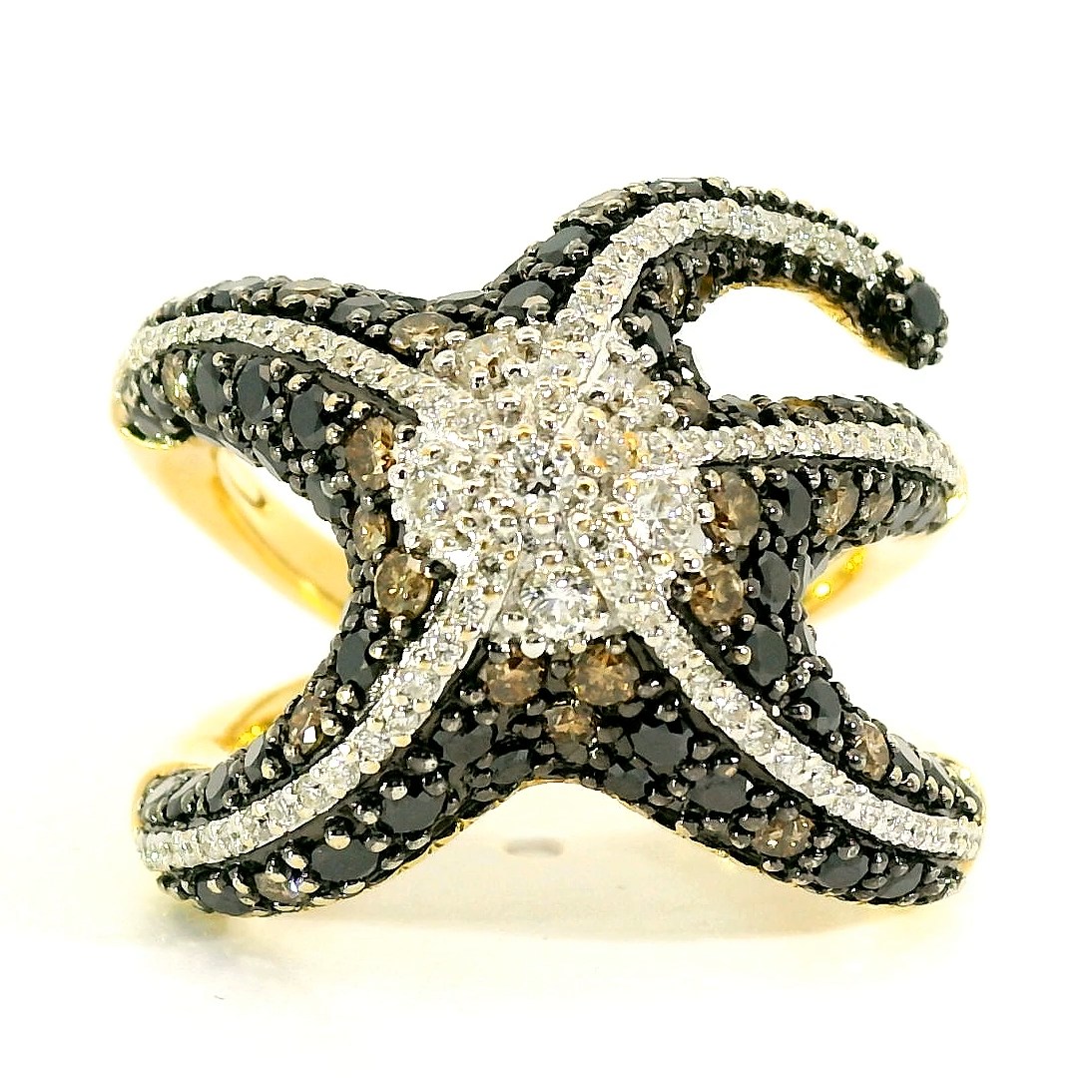Золотое кольцо с бриллиантами 2.29ct — настоящее произведение искусства, в котором воплощено не только мастерство ювелира, но и актуальные тренды. Это доказательство вашего изысканного вкуса, высокого статуса и яркий акцент в стильном образе. Вставка — 6 бриллиантов круглой огранки 0.18ct 3/5, 83 бриллианта круглой огранки 0.33ct 3/4-4/5, 21 бриллиант круглой огранки 0.52ct 7/5, 63 черных бриллианта круглой огранки 1.26ct 7/9, а обрамлением служит золото 750 пробы. Такое сочетание отлично смотрится и позволяет реализовывать самые необычные задумки вашего стиля. Размер ювелирного изделия — 17, а общий вес — 13.75 г, и на пальце оно выглядит просто шикарно, сразу привлекая восхищенное внимание.