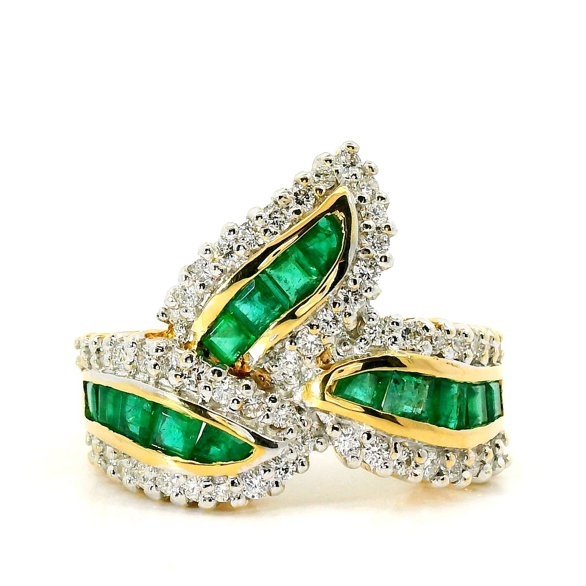 Золотое кольцо с изумрудами 0.88ct и бриллиантами 0.52ct — настоящее произведение искусства, в котором воплощено не только мастерство ювелира, но и актуальные тренды. Это доказательство вашего изысканного вкуса, высокого статуса и яркий акцент в стильном образе. Вставка — 14 изумрудов квадратной огранки 0.88ct 3/Г3, 52 бриллианта круглой огранки 0.52ct 3/4-4/5, а обрамлением служит золото 750 пробы. Такое сочетание отлично смотрится и позволяет реализовывать самые необычные задумки вашего стиля. Размер ювелирного изделия — 17, бесплатно изменим на любой от 16 до 18, а общий вес — 7.8 г, и на пальце оно выглядит просто шикарно, сразу привлекая восхищенное внимание.