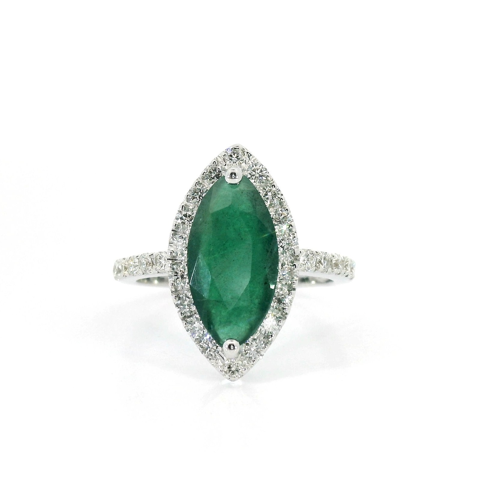 Золотое кольцо с изумрудом 1.75ct и бриллиантами 0.60ct — настоящее произведение искусства, в котором воплощено не только мастерство ювелира, но и актуальные тренды. Это доказательство вашего изысканного вкуса, высокого статуса и яркий акцент в стильном образе. Вставка — 1 изумруд огранки "маркиз" 1.75ct 3/К2, 28 бриллиантов круглой огранки 0.60ct 4/4-4/5, а обрамлением служит золото 750 пробы. Такое сочетание отлично смотрится и позволяет реализовывать самые необычные задумки вашего стиля. Размер ювелирного изделия — 17.5, бесплатно изменим на любой от 16.5 до 18.5, а общий вес — 4.82 г, и на пальце оно выглядит просто шикарно, сразу привлекая восхищенное внимание.