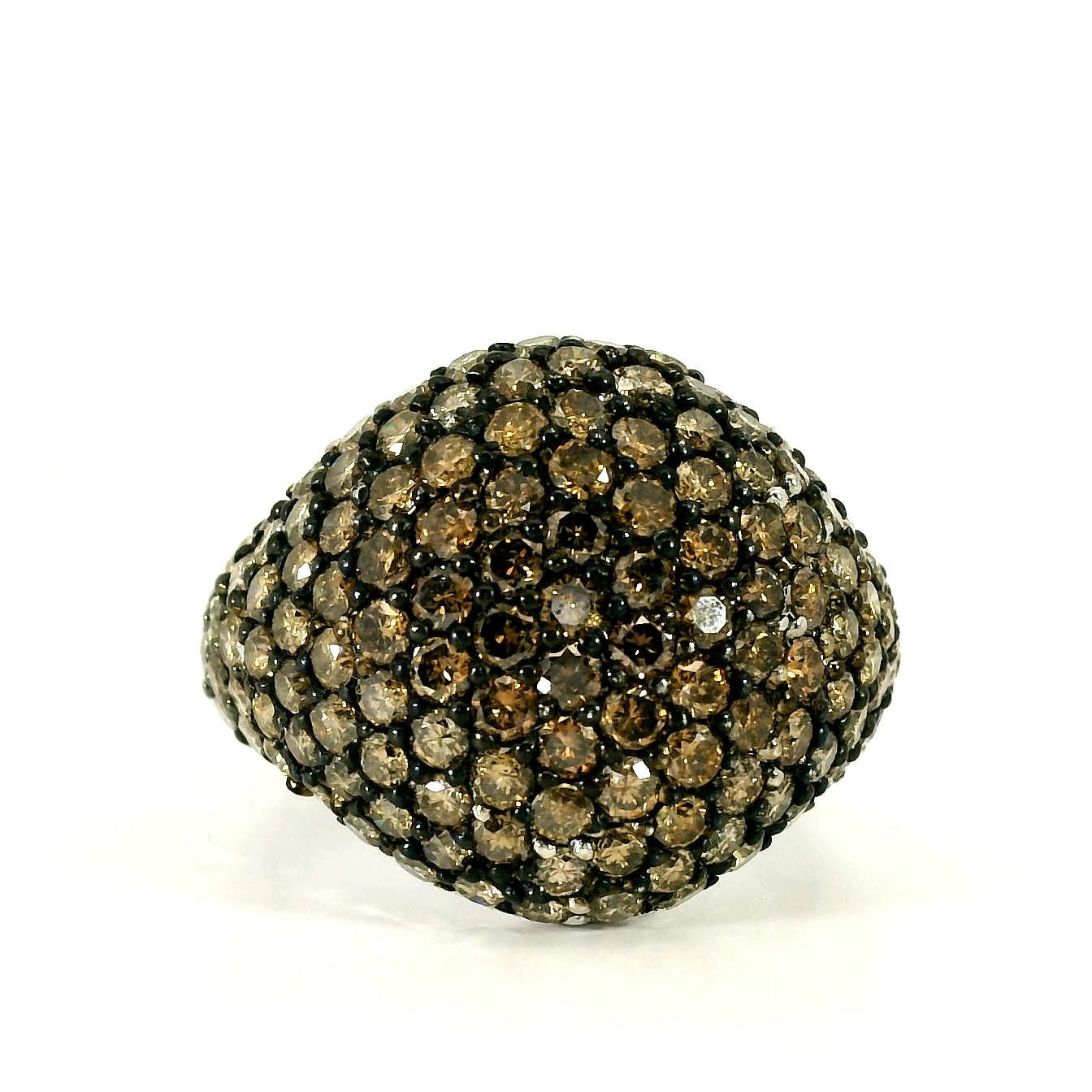 Золотое кольцо с коньячными бриллиантами 2.75ct — настоящее произведение искусства, в котором воплощено не только мастерство ювелира, но и актуальные тренды. Это доказательство вашего изысканного вкуса, высокого статуса и яркий акцент в стильном образе. Вставка — 131 бриллиант круглой огранки 2.75ct 7/5-7/6, а обрамлением служит золото 750 пробы. Такое сочетание отлично смотрится и позволяет реализовывать самые необычные задумки вашего стиля. Размер ювелирного изделия — 17.5, бесплатно изменим на любой от 16.5 до 18.5, а общий вес — 7.86 г, и на пальце оно выглядит просто шикарно, сразу привлекая восхищенное внимание.