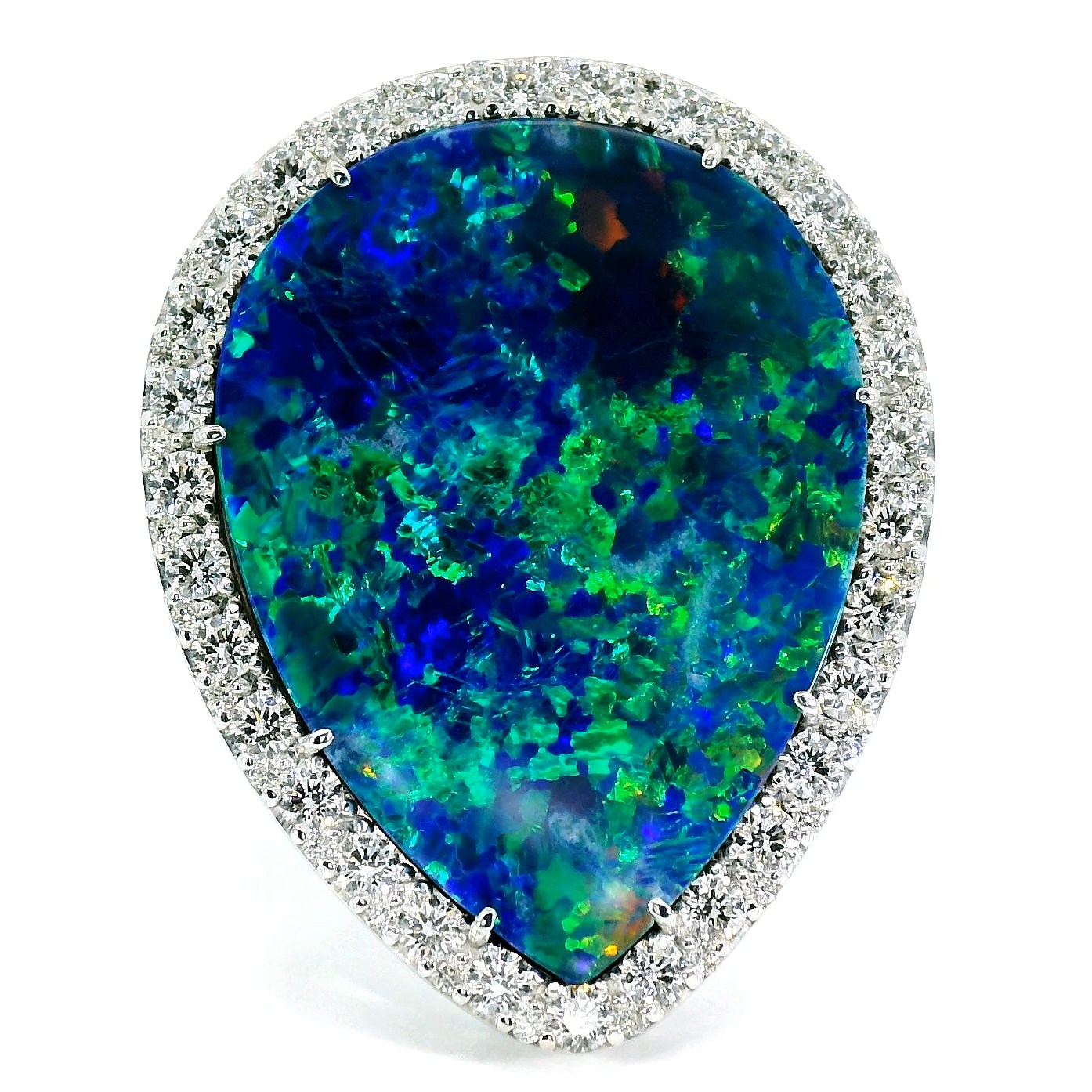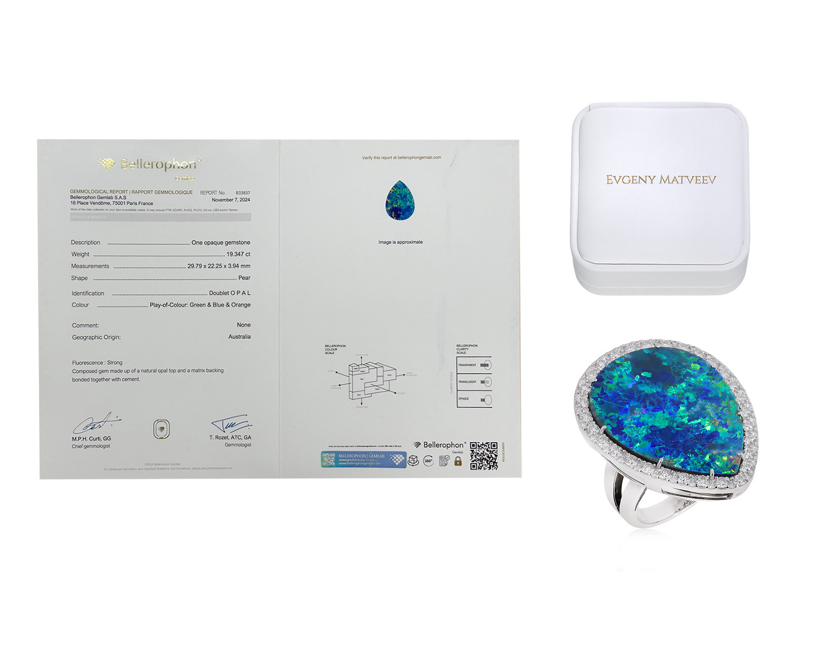 Золотое кольцо с опалом Австралия 19.34ct Evgeny Matveev — настоящее произведение искусства, в котором воплощено не только мастерство ювелира, но и актуальные тренды. Это доказательство вашего изысканного вкуса, высокого статуса и яркий акцент в стильном образе. Вставка — 1 дуплет опал Австралия огранки "кабошон груша" 19.34ct Bellerophon B33837, 1 турмалин параиба круглой огранки 0.01ct, 60 бриллиантов круглой огранки 1.41ct 3/4-3/5, а обрамлением служит золото 750 пробы. Такое сочетание отлично смотрится и позволяет реализовывать самые необычные задумки вашего стиля. Размер ювелирного изделия — 18, а общий вес — 16.07 г, и на пальце оно выглядит просто шикарно, сразу привлекая восхищенное внимание.