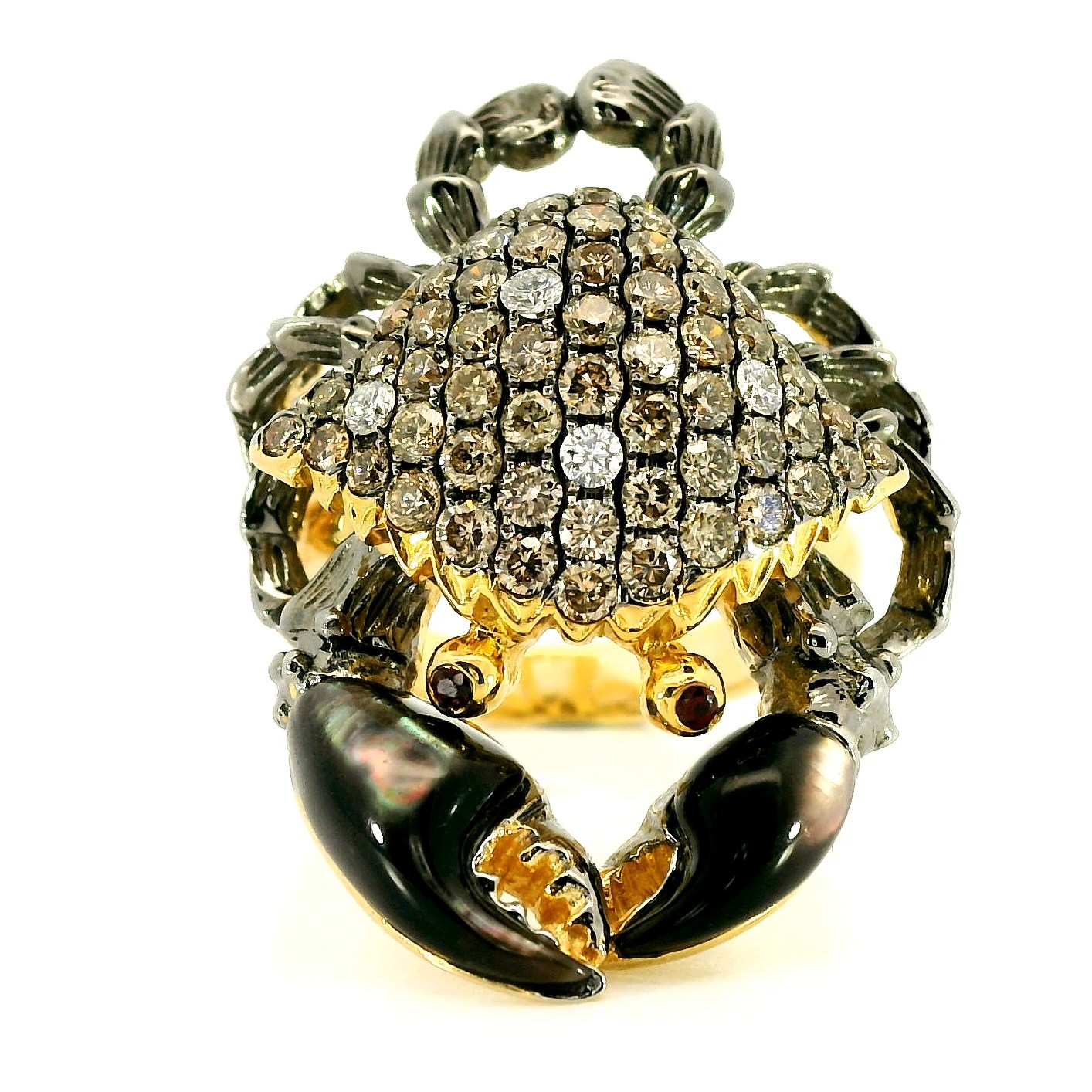 Золотое кольцо с перламутром 2.21ct и бриллиантами 1.57ct — настоящее произведение искусства, в котором воплощено не только мастерство ювелира, но и актуальные тренды. Это доказательство вашего изысканного вкуса, высокого статуса и яркий акцент в стильном образе. Вставка — 2 перламутра фантазийной огранки 2.21ct, 2 рубина круглой огранки 0.03ct 2/2, 4 бриллианта круглой огранки 0.10ct 3/5, 64 бриллианта круглой огранки 1.47ct 6/5-7/6, а обрамлением служит золото 585 пробы. Такое сочетание отлично смотрится и позволяет реализовывать самые необычные задумки вашего стиля. Размер ювелирного изделия — 17.5, бесплатно изменим на любой от 16.5 до 18.5, а общий вес — 12.51 г, и на пальце оно выглядит просто шикарно, сразу привлекая восхищенное внимание.
