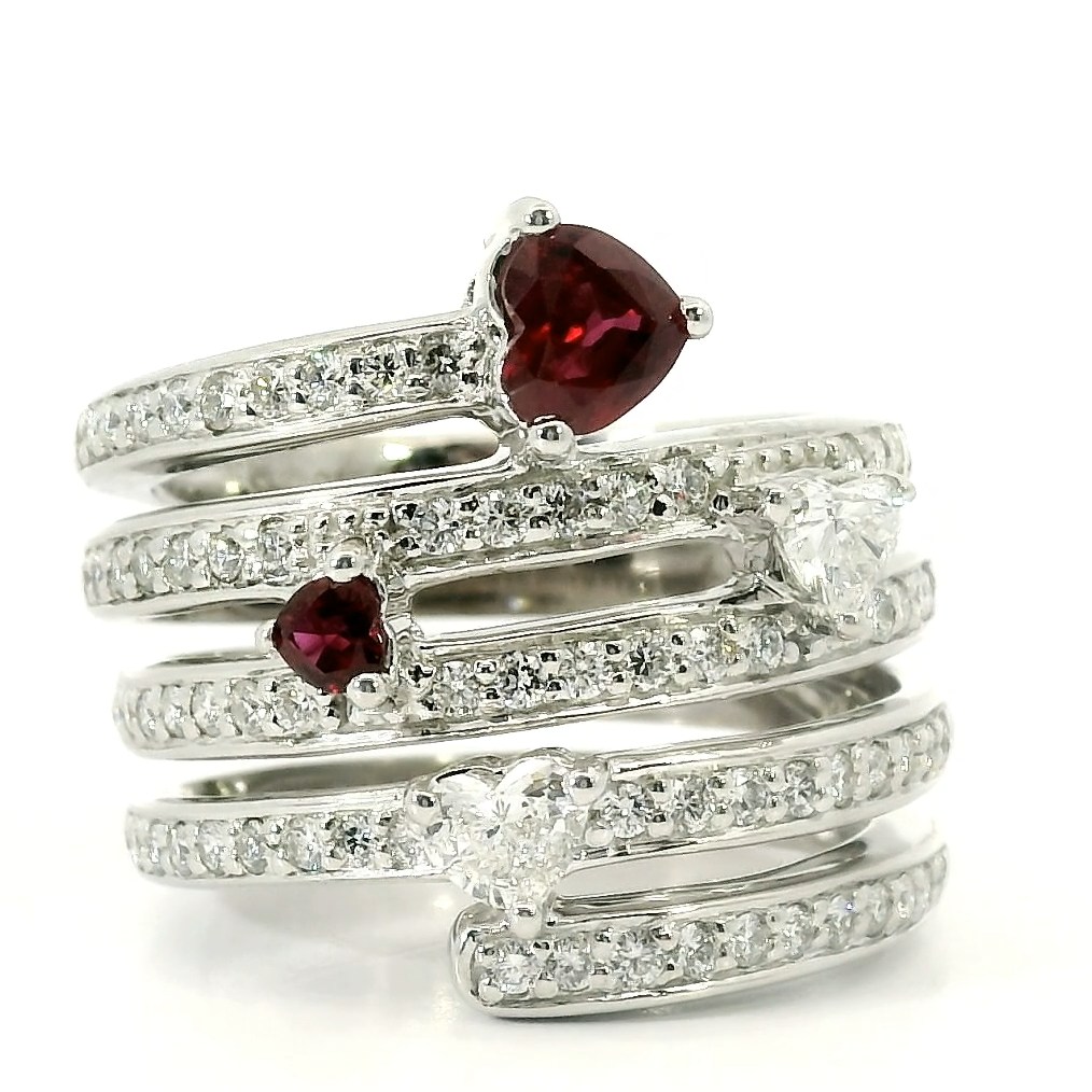 Золотое кольцо с рубинами 0.62ct и бриллиантами 1.06ct — настоящее произведение искусства, в котором воплощено не только мастерство ювелира, но и актуальные тренды. Это доказательство вашего изысканного вкуса, высокого статуса и яркий акцент в стильном образе. Вставка — 1 рубин огранки "сердце" 0.52ct 4/2, 1 рубин огранки "сердце" 0.10ct 4/3, 2 бриллианта огранки "сердце" 0.33ct 3/4, 73 бриллианта круглой огранки 0.73ct 3/4, а обрамлением служит золото 750 пробы. Такое сочетание отлично смотрится и позволяет реализовывать самые необычные задумки вашего стиля. Размер ювелирного изделия — 17.5, а общий вес — 14.64 г, и на пальце оно выглядит просто шикарно, сразу привлекая восхищенное внимание.