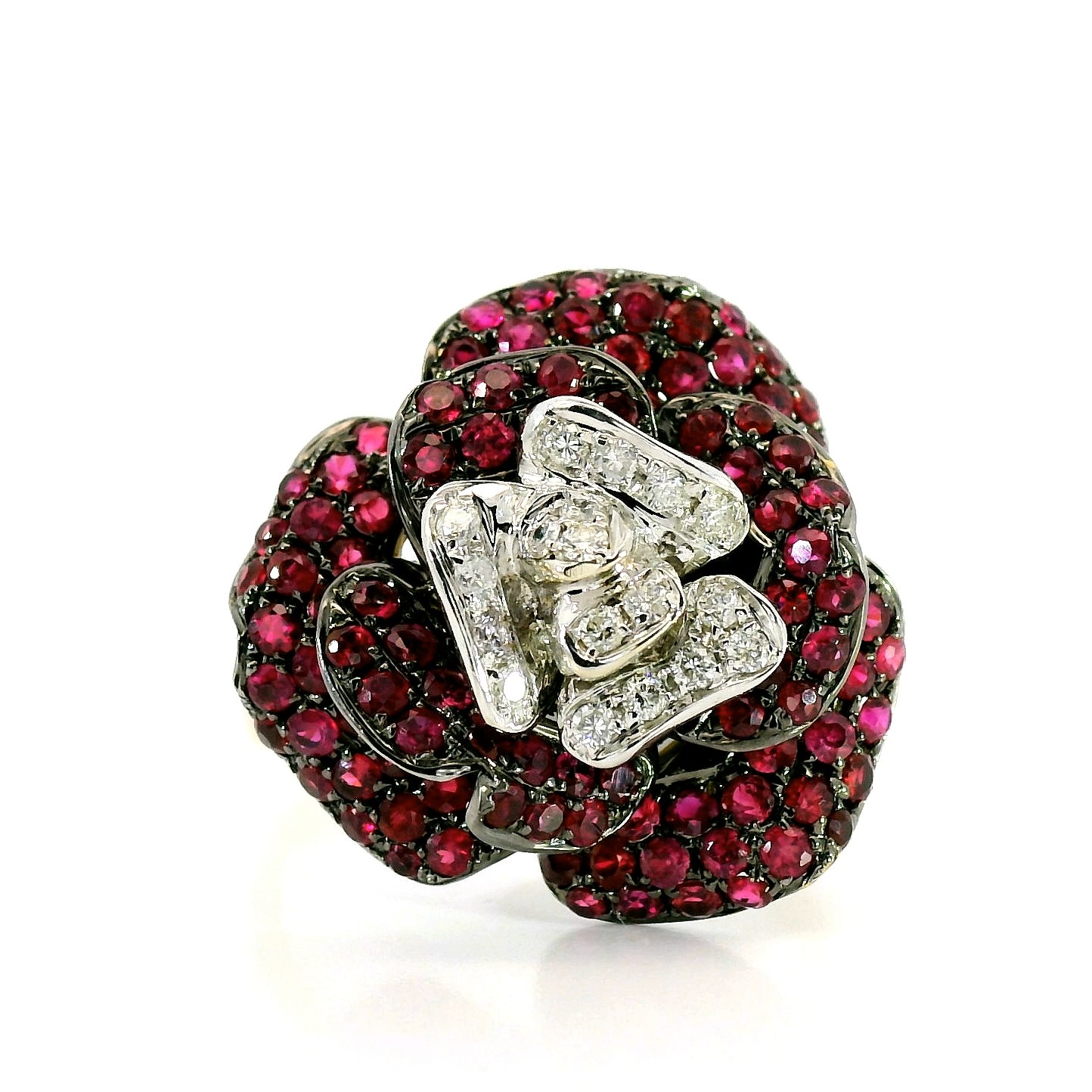 Золотое кольцо с рубинами 1.54ct и бриллиантами 0.15ct — настоящее произведение искусства, в котором воплощено не только мастерство ювелира, но и актуальные тренды. Это доказательство вашего изысканного вкуса, высокого статуса и яркий акцент в стильном образе. Вставка — 108 рубинов круглой огранки 1.54ct 4/2-4/3, 18 бриллиантов круглой огранки 0.15ct 3/4-3/6, а обрамлением служит золото 750 пробы. Такое сочетание отлично смотрится и позволяет реализовывать самые необычные задумки вашего стиля. Размер ювелирного изделия — 17.25, бесплатно изменим на любой от 16.25 до 18.25, а общий вес — 6.74 г, и на пальце оно выглядит просто шикарно, сразу привлекая восхищенное внимание.
