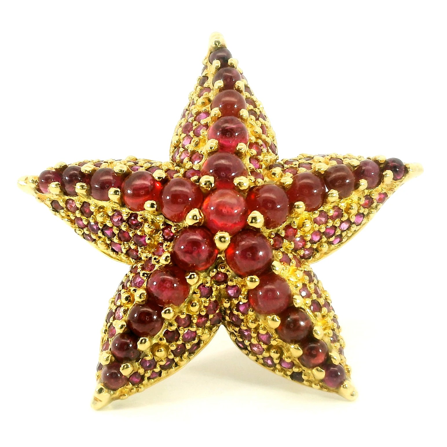 Золотое кольцо с рубинами 22.23ct — настоящее произведение искусства, в котором воплощено не только мастерство ювелира, но и актуальные тренды. Это доказательство вашего изысканного вкуса, высокого статуса и яркий акцент в стильном образе. Вставка — 26 рубинов огранки "круглый кабошон" 15.60ct С/К2, 126 рубинов круглой огранки 6.63ct 4/2-5/4, а обрамлением служит золото 750 пробы. Такое сочетание отлично смотрится и позволяет реализовывать самые необычные задумки вашего стиля. Размер ювелирного изделия — 17.5, а общий вес — 32.93 г, и на пальце оно выглядит просто шикарно, сразу привлекая восхищенное внимание.