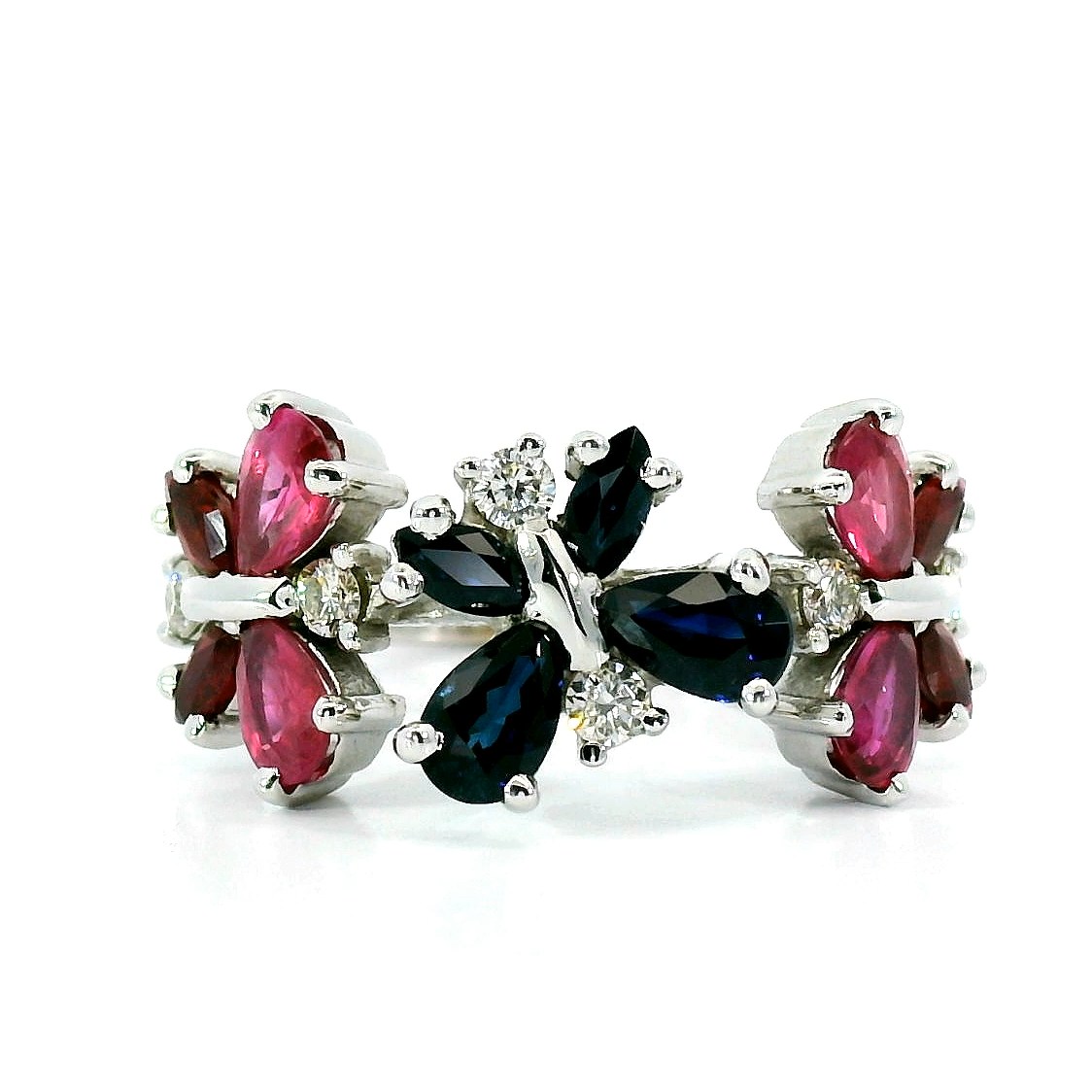 Золотое кольцо с сапфирами 0.60ct и рубинами 1.27ct — настоящее произведение искусства, в котором воплощено не только мастерство ювелира, но и актуальные тренды. Это доказательство вашего изысканного вкуса, высокого статуса и яркий акцент в стильном образе. Вставка — 2 сапфира огранки "груша" 0.45ct 5/2, 2 сапфира огранки "маркиз" 0.15ct 5/3, 4 рубина огранки "груша" 0.91ct 5/3, 4 рубина огранки "маркиз" 0.36ct 4/3, 6 бриллиантов круглой огранки 0.19ct 4/4, а обрамлением служит золото 585 пробы. Такое сочетание отлично смотрится и позволяет реализовывать самые необычные задумки вашего стиля. Размер ювелирного изделия — 17, бесплатно изменим на любой от 16 до 18, а общий вес — 4.4 г, и на пальце оно выглядит просто шикарно, сразу привлекая восхищенное внимание.