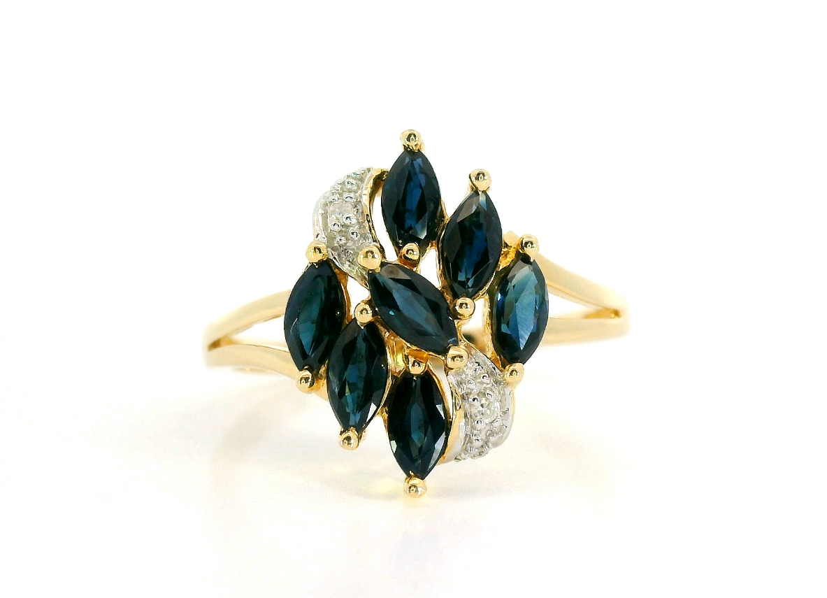 Золотое кольцо с сапфирами 1.12ct и бриллиантами 0.01ct — настоящее произведение искусства, в котором воплощено не только мастерство ювелира, но и актуальные тренды. Это доказательство вашего изысканного вкуса, высокого статуса и яркий акцент в стильном образе. Вставка — 7 сапфиров огранки "маркиз" 1.12ct 5/2, 2 бриллианта круглой огранки 0.01ct 2/3 Кр-17, а обрамлением служит золото 585 пробы. Такое сочетание отлично смотрится и позволяет реализовывать самые необычные задумки вашего стиля. Размер ювелирного изделия — 17.5, бесплатно изменим на любой от 16.5 до 19, а общий вес — 2.76 г, и на пальце оно выглядит просто шикарно, сразу привлекая восхищенное внимание.