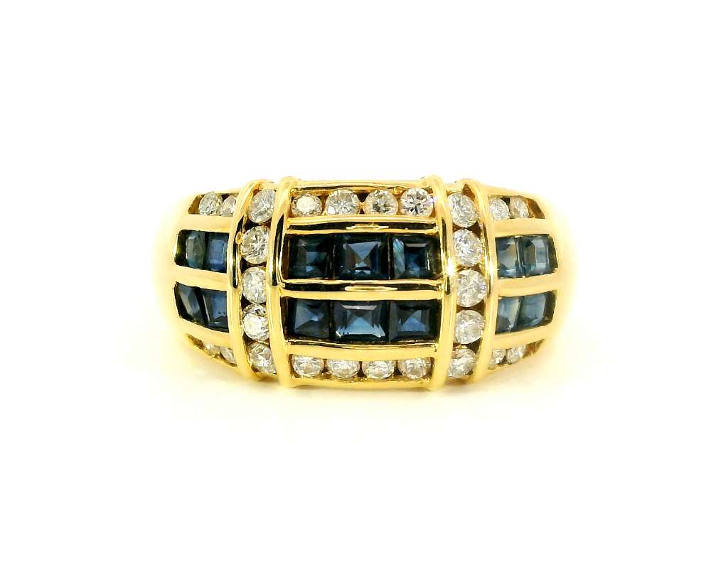 Золотое кольцо с сапфирами 1.15ct и бриллиантами 0.45ct — настоящее произведение искусства, в котором воплощено не только мастерство ювелира, но и актуальные тренды. Это доказательство вашего изысканного вкуса, высокого статуса и яркий акцент в стильном образе. Вставка — 14 сапфиров квадратной огранки 1.15ct 4/2, 26 бриллиантов круглой огранки 0.45ct 3/5-3/6, а обрамлением служит золото 750 пробы. Такое сочетание отлично смотрится и позволяет реализовывать самые необычные задумки вашего стиля. Размер ювелирного изделия — 18.25, бесплатно изменим на любой от 17.25 до 19.25, а общий вес — 7.26 г, и на пальце оно выглядит просто шикарно, сразу привлекая восхищенное внимание.