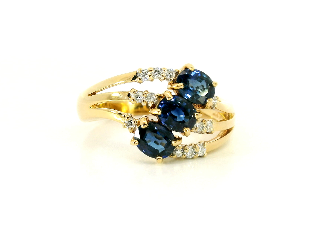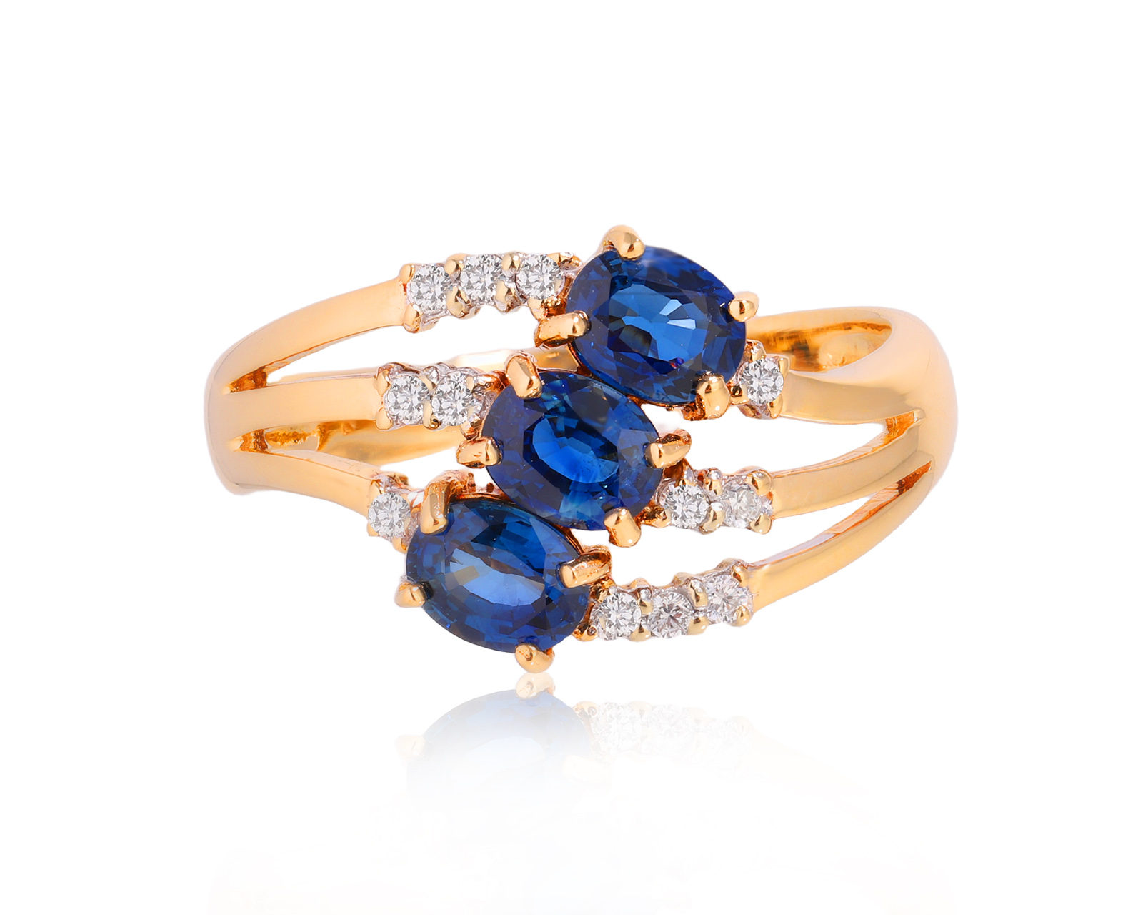 Золотое кольцо с сапфирами 1.23ct и бриллиантами 0.12ct — настоящее произведение искусства, в котором воплощено не только мастерство ювелира, но и актуальные тренды. Это доказательство вашего изысканного вкуса, высокого статуса и яркий акцент в стильном образе. Вставка — 3 сапфира овальной огранки 1.23ct 3/2, 12 бриллиантов круглой огранки 0.12ct 3/3, а обрамлением служит золото 750 пробы. Такое сочетание отлично смотрится и позволяет реализовывать самые необычные задумки вашего стиля. Размер ювелирного изделия — 17.25, бесплатно изменим на любой от 16.75 до 18.75, а общий вес — 4.85 г, и на пальце оно выглядит просто шикарно, сразу привлекая восхищенное внимание.