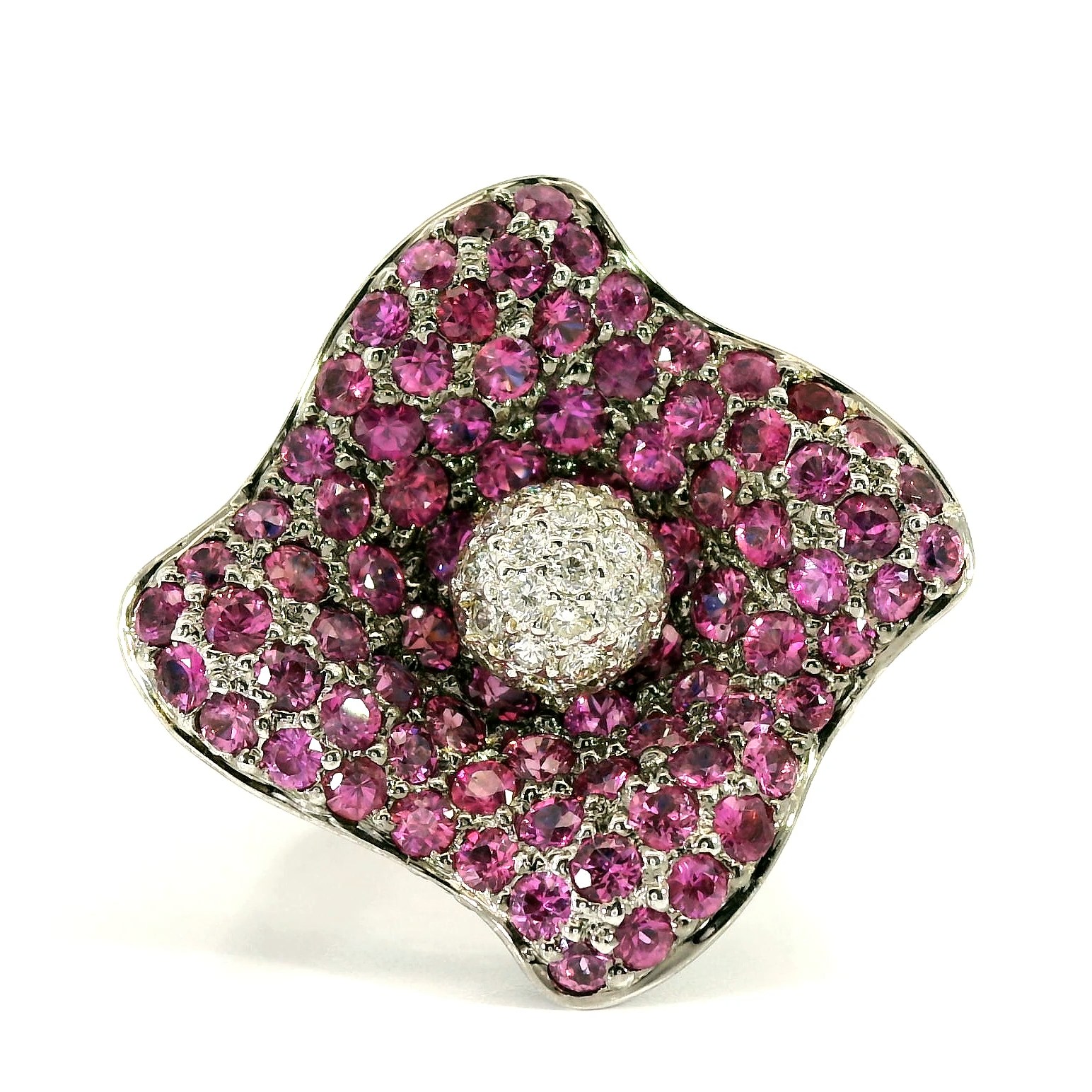 Золотое кольцо с сапфирами 7.01ct и бриллиантами 0.32ct — настоящее произведение искусства, в котором воплощено не только мастерство ювелира, но и актуальные тренды. Это доказательство вашего изысканного вкуса, высокого статуса и яркий акцент в стильном образе. Вставка — 80 розовых сапфиров круглой огранки 3.20ct, 127 сапфиров круглой огранки 3.81ct 2/2-3/3, 29 бриллиантов круглой огранки 0.32ct 3/3-4/4, а обрамлением служит золото 750 пробы. Такое сочетание отлично смотрится и позволяет реализовывать самые необычные задумки вашего стиля. Размер ювелирного изделия — 17, бесплатно изменим на любой от 16.5 до 17.5, а общий вес — 14.31 г, и на пальце оно выглядит просто шикарно, сразу привлекая восхищенное внимание.