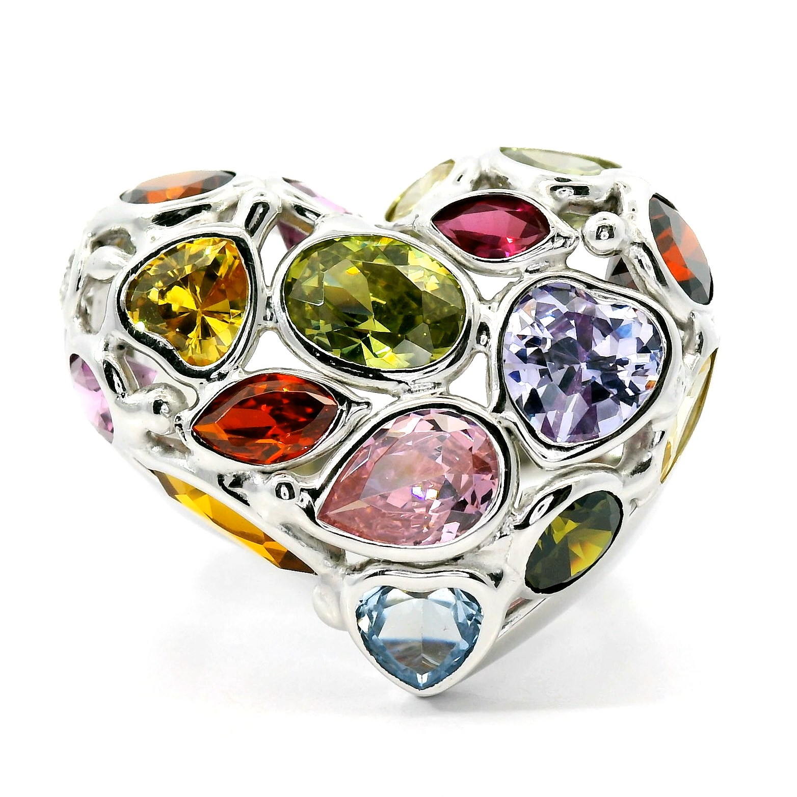 Золотое кольцо с цветными фианитами 7.00ct — настоящее произведение искусства, в котором воплощено не только мастерство ювелира, но и актуальные тренды. Это доказательство вашего изысканного вкуса, высокого статуса и яркий акцент в стильном образе. Вставка — 6 фианитов круглой огранки 2.08ct, 4 фианита огранки "сердце" 1.65ct, 4 фианита огранки "маркиз" 1.27ct, 1 фианит овальной огранки 1.00ct, 1 фианит огранки "груша" 1.00ct, 1 бриллиант круглой огранки 0.08ct 4/7, а обрамлением служит золото 750 пробы. Такое сочетание отлично смотрится и позволяет реализовывать самые необычные задумки вашего стиля. Размер ювелирного изделия — 18, а общий вес — 13.1 г, и на пальце оно выглядит просто шикарно, сразу привлекая восхищенное внимание.
