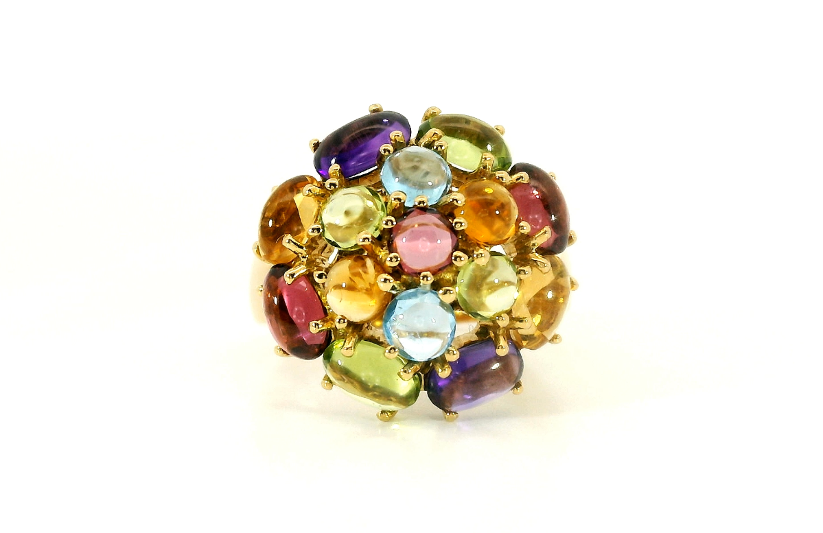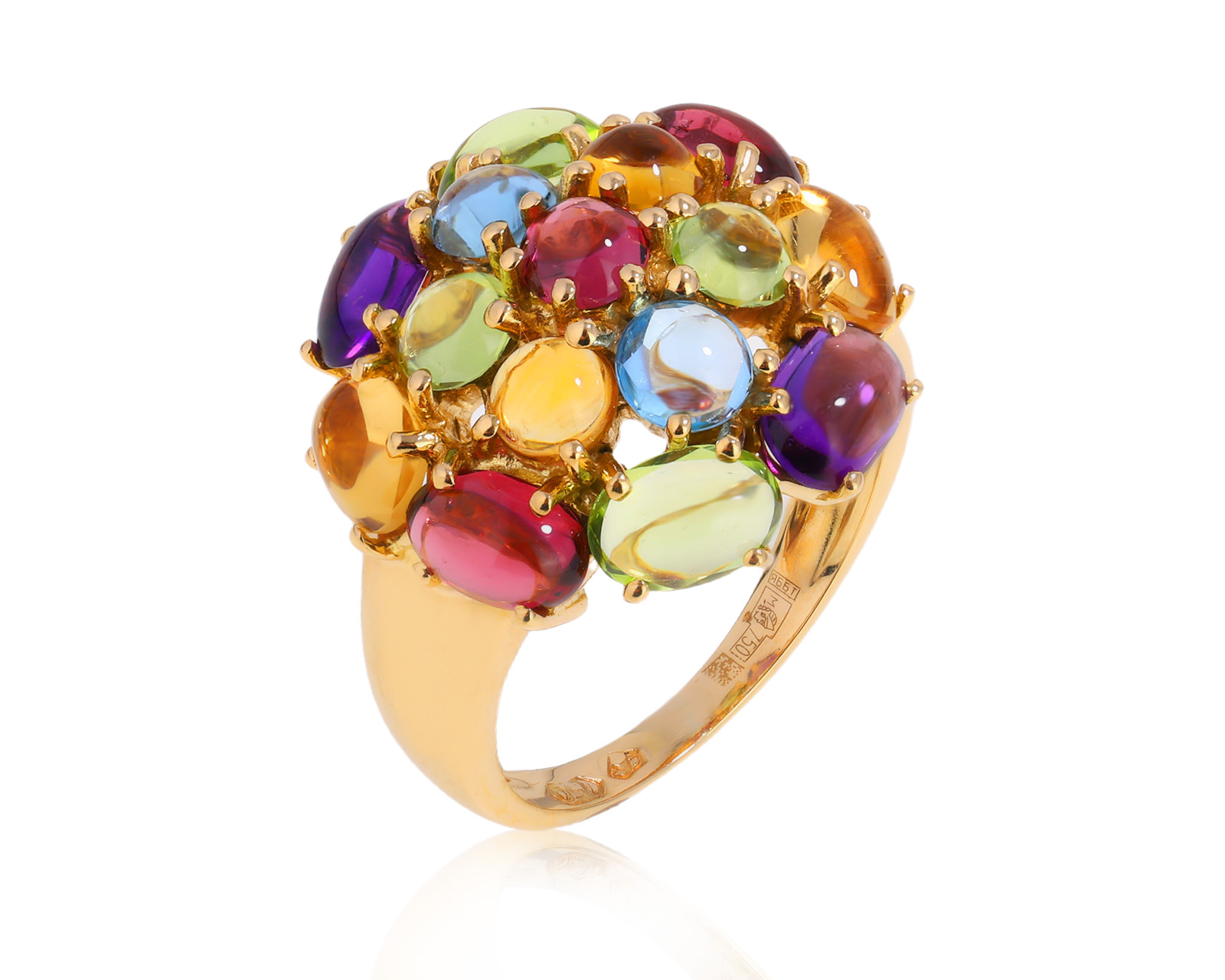 Золотое кольцо с цветными камнями 5.06ct — настоящее произведение искусства, в котором воплощено не только мастерство ювелира, но и актуальные тренды. Это доказательство вашего изысканного вкуса, высокого статуса и яркий акцент в стильном образе. Вставка — 2 аметиста огранки "овальный кабошон" 0.70ct, 2 цитрина огранки "овальный кабошон" 0.70ct, 2 граната огранки "овальный кабошон" 1.06ct, 2 хризолита огранки "овальный кабошон" 0.88ct, 1 гранат огранки "круглый кабошон" 0.30ct, 2 цитрина огранки "круглый кабошон" 0.40ct, 2 хризолита огранки "круглый кабошон" 0.50ct, 2 топаза огранки "круглый кабошон" 0.52ct, а обрамлением служит золото 750 пробы. Такое сочетание отлично смотрится и позволяет реализовывать самые необычные задумки вашего стиля. Размер ювелирного изделия — 16.5, бесплатно изменим на любой от 16 до 17, а общий вес — 7.06 г, и на пальце оно выглядит просто шикарно, сразу привлекая восхищенное внимание.