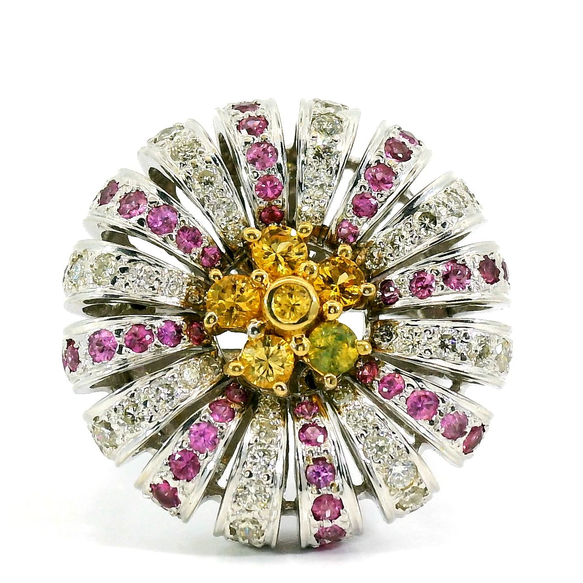 Золотое кольцо с цветными сапфирами 0.70ct — настоящее произведение искусства, в котором воплощено не только мастерство ювелира, но и актуальные тренды. Это доказательство вашего изысканного вкуса, высокого статуса и яркий акцент в стильном образе. Вставка — 54 цветных сапфира круглой огранки 0.70ct, 48 бриллиантов круглой огранки 0.45ct 4/4, а обрамлением служит золото 750 пробы. Такое сочетание отлично смотрится и позволяет реализовывать самые необычные задумки вашего стиля. Размер ювелирного изделия — 17, бесплатно изменим на любой от 16 до 18, а общий вес — 11.44 г, и на пальце оно выглядит просто шикарно, сразу привлекая восхищенное внимание.