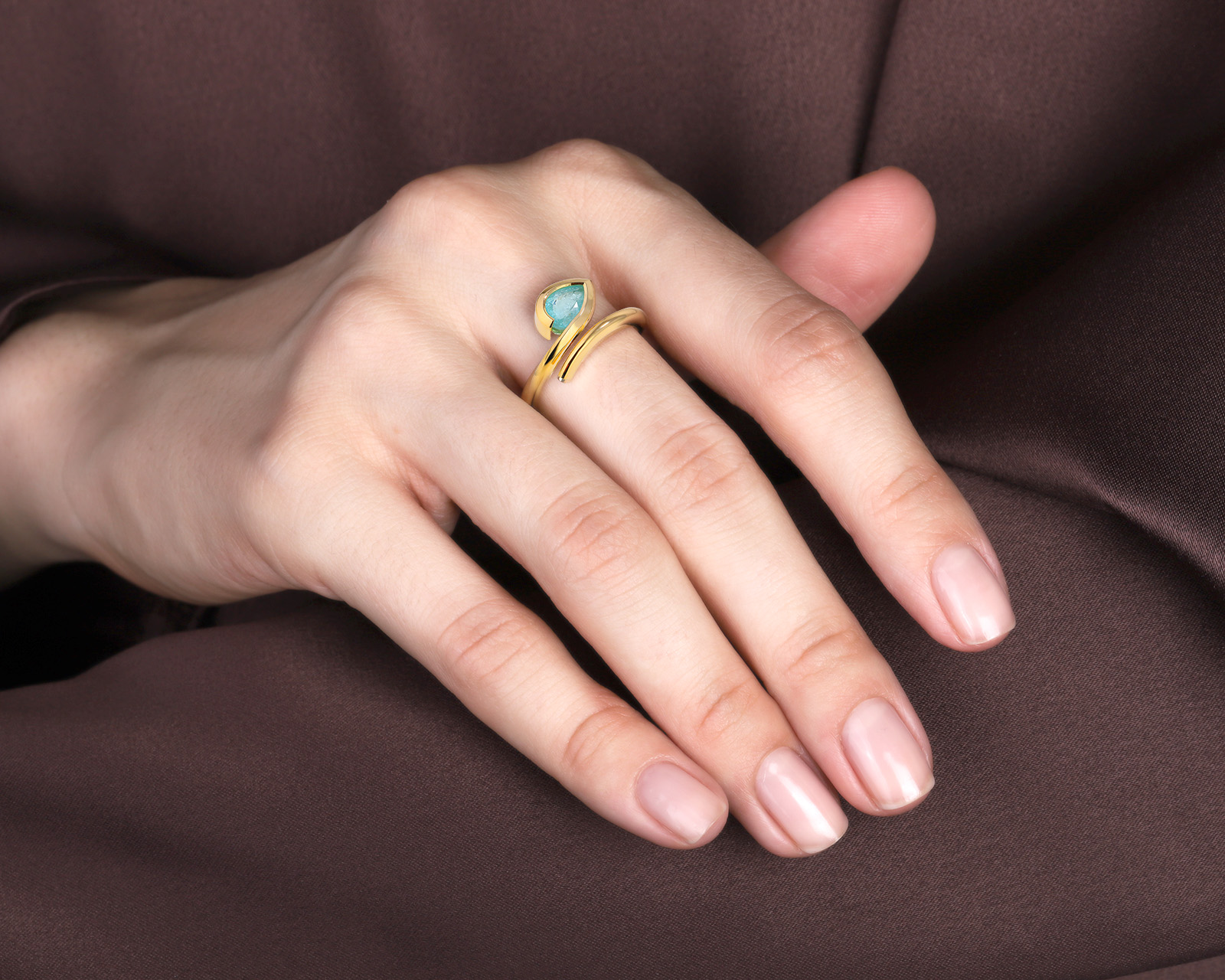 Золотое кольцо с турмалином параиба Мозамбик 1.25ct Evgeny Matveev — настоящее произведение искусства, в котором воплощено не только мастерство ювелира, но и актуальные тренды. Это доказательство вашего изысканного вкуса, высокого статуса и яркий акцент в стильном образе. Вставка — 1 турмалин параиба Мозамбик огранки "груша" 1.25ct Bellerophon B34359, 1 турмалин параиба круглой огранки 0.01ct, а обрамлением служит золото 750 пробы. Такое сочетание отлично смотрится и позволяет реализовывать самые необычные задумки вашего стиля. Размер ювелирного изделия — 17.25, а общий вес — 5.72 г, и на пальце оно выглядит просто шикарно, сразу привлекая восхищенное внимание.