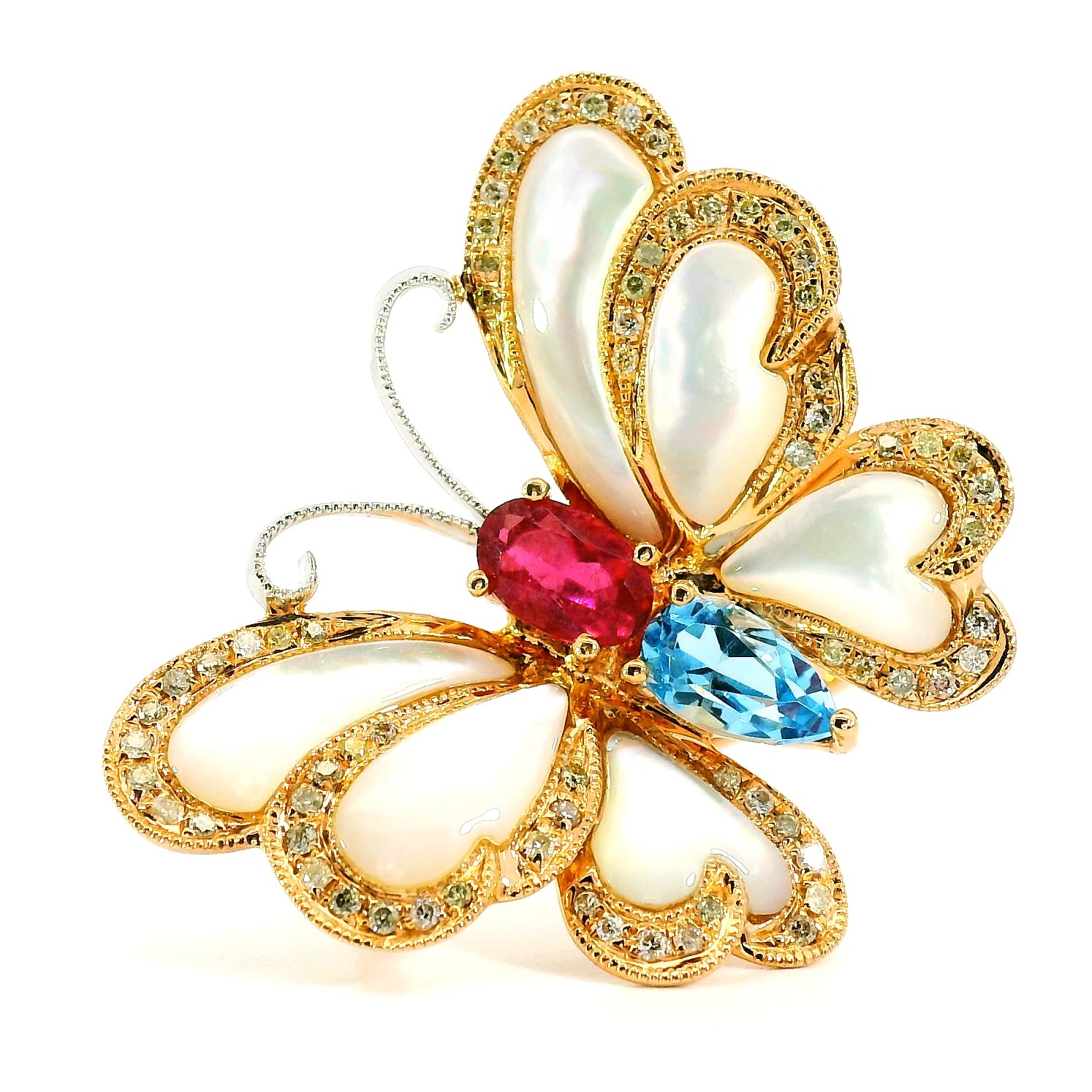 Золотое кольцо с турмалином рубеллитом 0.51ct и перламутром 3.14ct — настоящее произведение искусства, в котором воплощено не только мастерство ювелира, но и актуальные тренды. Это доказательство вашего изысканного вкуса, высокого статуса и яркий акцент в стильном образе. Вставка — 1 турмалин рубеллит овальной огранки 0.51ct, 1 топаз огранки "груша" 0.72ct, 6 перламутров фантазийной огранки 3.14ct, 68 бриллиантов круглой огранки 0.27ct 3/5-6/6, а обрамлением служит золото 585 пробы. Такое сочетание отлично смотрится и позволяет реализовывать самые необычные задумки вашего стиля. Размер ювелирного изделия — 17.5, бесплатно изменим на любой от 16.5 до 18.5, а общий вес — 6.8 г, и на пальце оно выглядит просто шикарно, сразу привлекая восхищенное внимание.