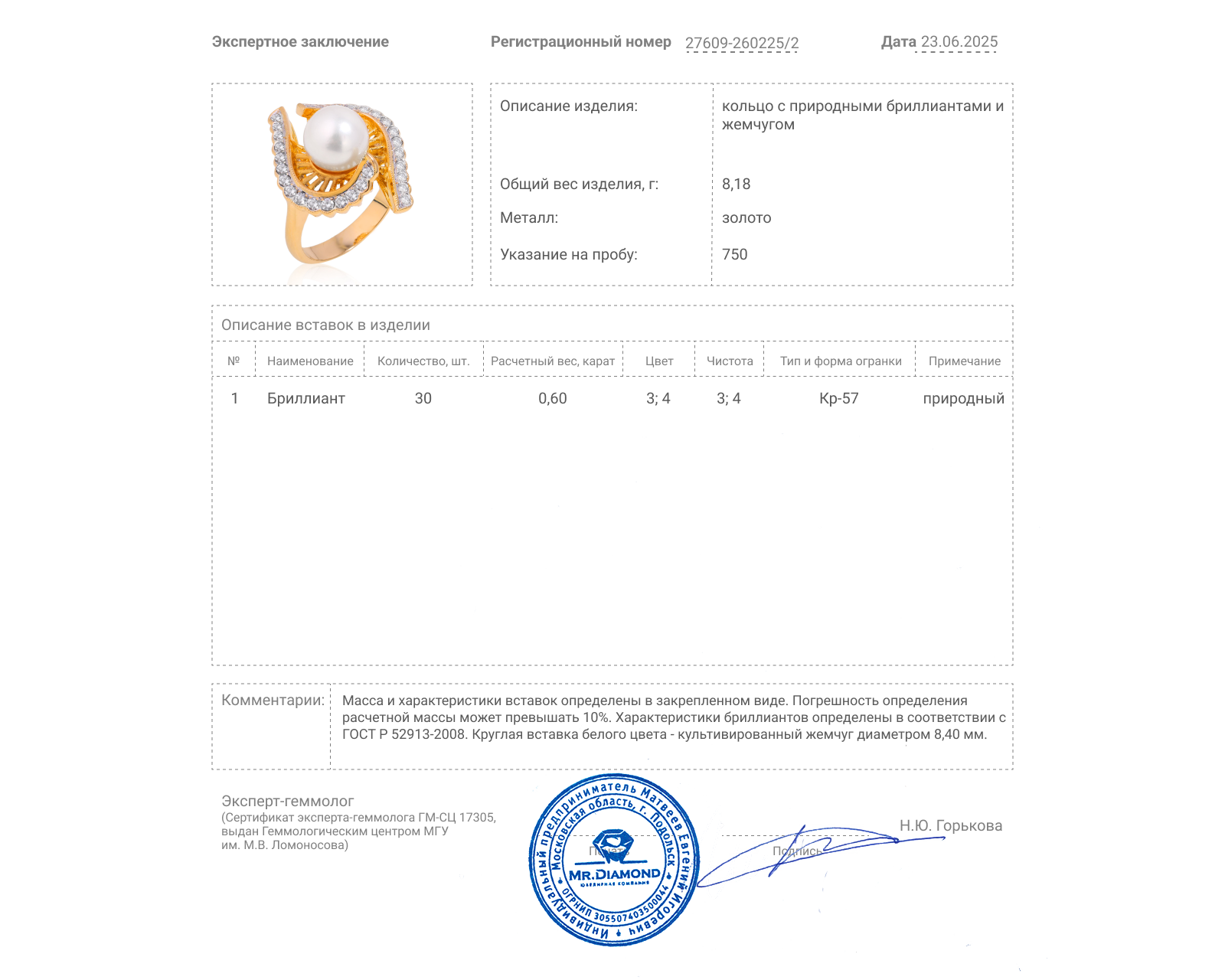 Золотое кольцо с жемчугом 8.40 мм и бриллиантами 0.60ct — настоящее произведение искусства, в котором воплощено не только мастерство ювелира, но и актуальные тренды. Это доказательство вашего изысканного вкуса, высокого статуса и яркий акцент в стильном образе. Вставка — 1 жемчуг 8.40 мм, 30 бриллиантов круглой огранки 0.60ct 3/3-4/4, а обрамлением служит золото 750 пробы. Такое сочетание отлично смотрится и позволяет реализовывать самые необычные задумки вашего стиля. Размер ювелирного изделия — 16.75, бесплатно изменим на любой от 15.75 до 17.75, а общий вес — 8.18 г, и на пальце оно выглядит просто шикарно, сразу привлекая восхищенное внимание.