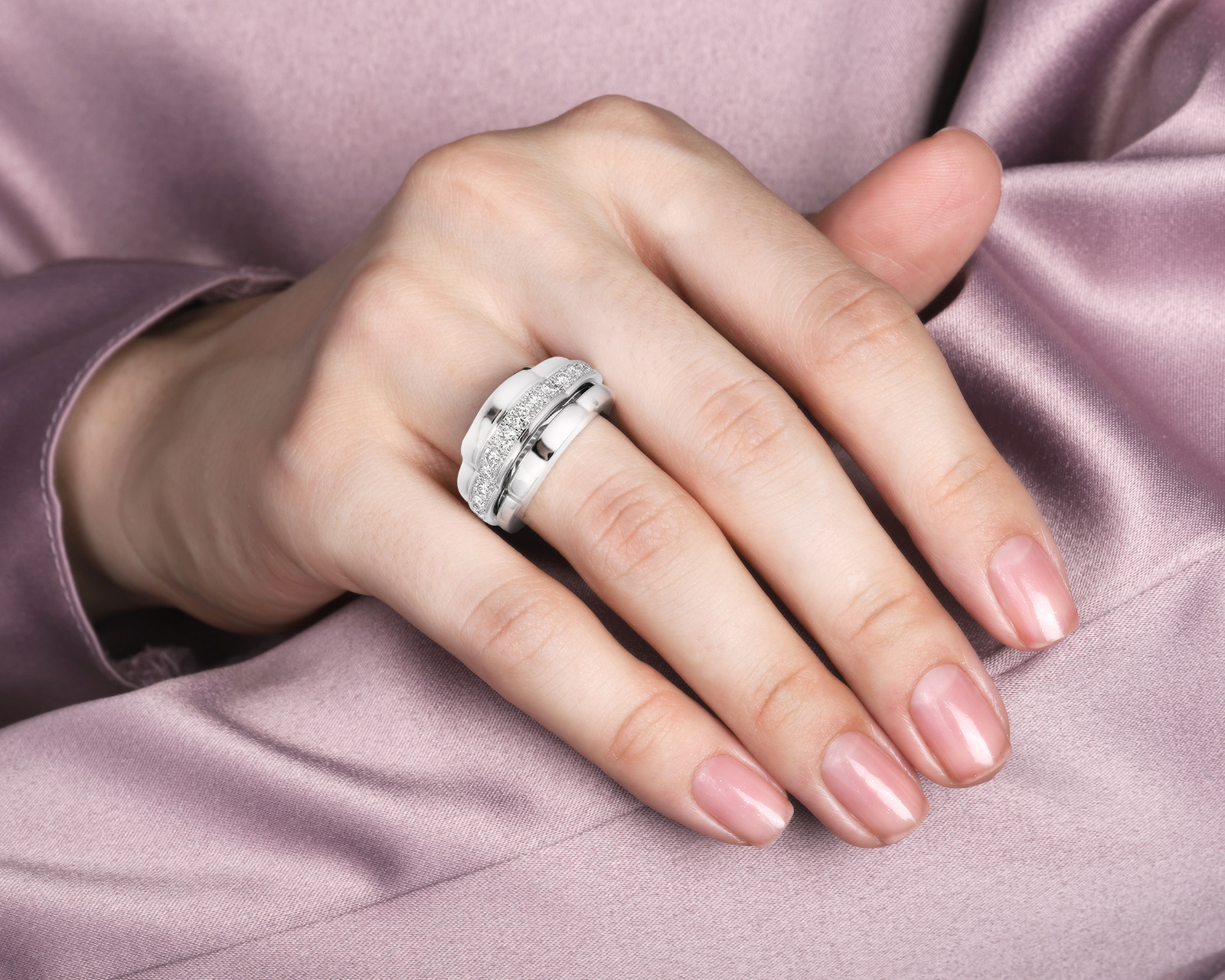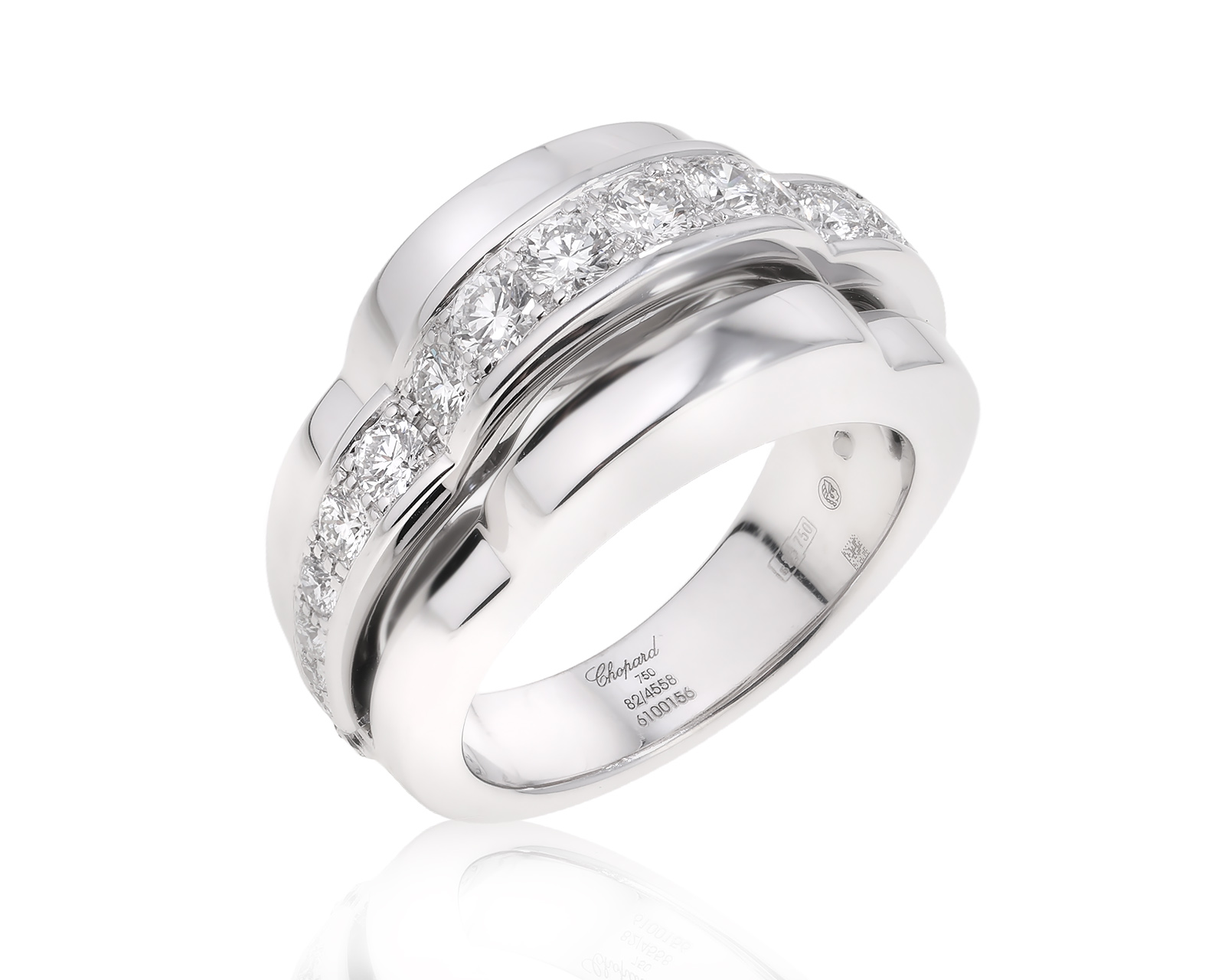 - Chopardissimo — лаконичные широкие кольца с каллиграфическим выгравированным логотипом Chopard и бриллиантовыми вставками.